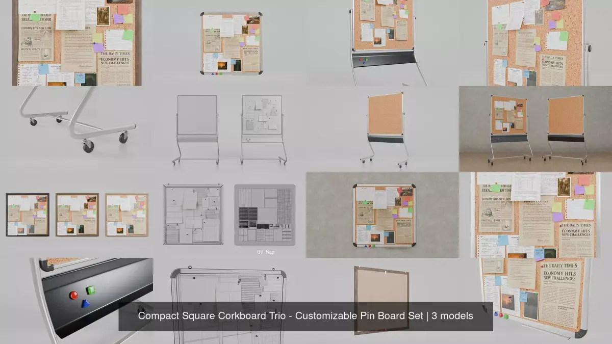 A high-quality 3D asset featuring a set of three fully customizable corkboards, two wall-mounted corkboards with wooden and metal frames, and a standing double-sided corkboard, all in square forms, complete with pre-assembled office accessories. Ideal for office scenes, classroom environments, architectural visualization, and game design.