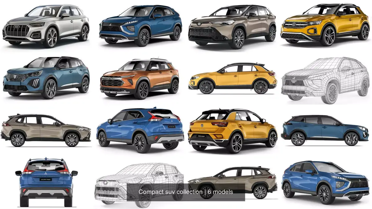 Compact suv collection. The kit includes: Volkswagen T-Roc 2022, Mitsubishi Eclipse Cross 2022, Peugeot e-2008 2024, Audi Q5 Advanced 2022, Chevrolet Trailblazer 2024, Toyota Corolla Cross 2023. The main elements are prepared for TurboSmooth smoothing (2 Iteration). The elements of the body, wheels, interior have been worked out - conditionally.