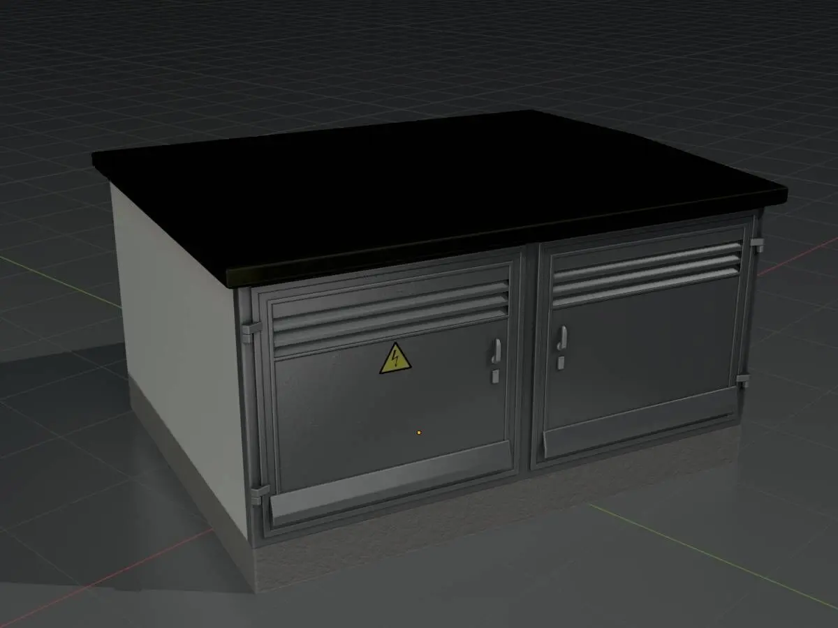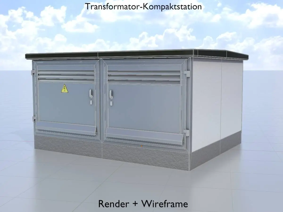 - Hier sehen Sie ein 3D-Modell einer Transformatorenstation, auch Kompaktstation, Ortsnetzstation oder kurz Trafostation genannt.