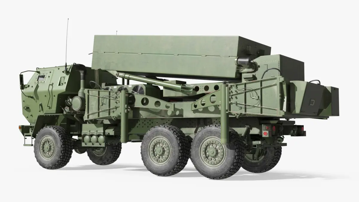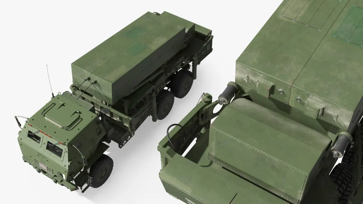 This model accurately represents the HIMARS M142, featuring its distinctive six-wheel drive chassis, armored cabin, and missile launch system. It showcases detailed components, such as the launch platform and realistic surface textures, to provide an authentic representation of the real-life artillery system.