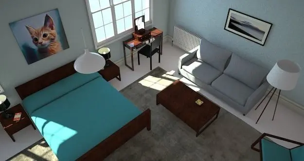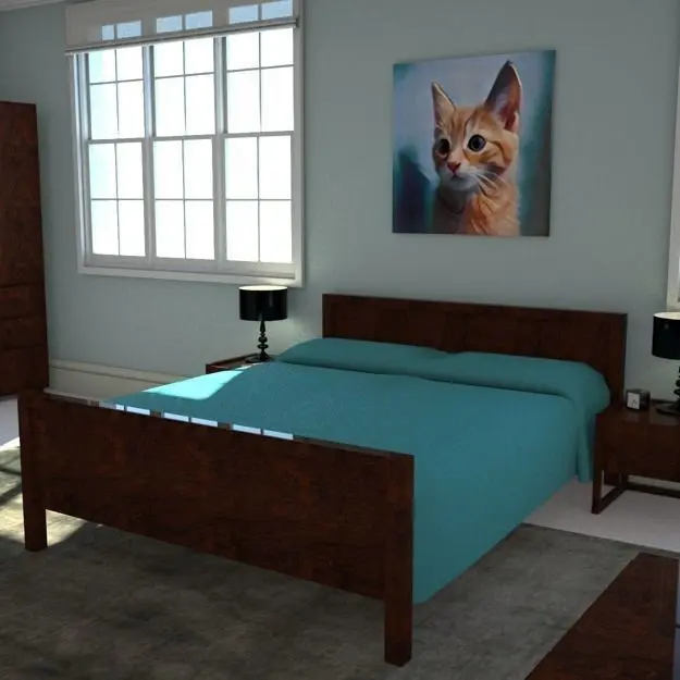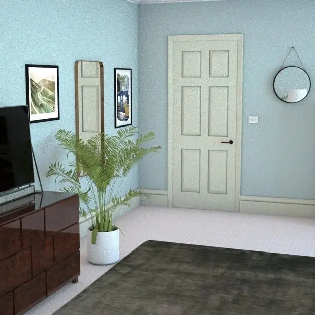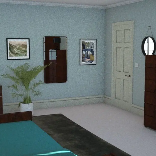 Additional itemssophisticated, contemporary chair, black leatherantique dressing table mirrorfamily photoskitten paintingsmall, round hanging mirrorlarge, modern classic rectangular mirrorradiatorcream carpetluxury grey silk rugteal bedlinen & pillows2 seater grey linen sofagold ashtray65"smart TVcountryside pictures in simple black frames6 panel door with simple modern lever handleblack lacquer table lampalarm clockpaperback bookwindowblinds light switch standard tripod lampmodern walnut rocking chair with teal upholsterypendant light