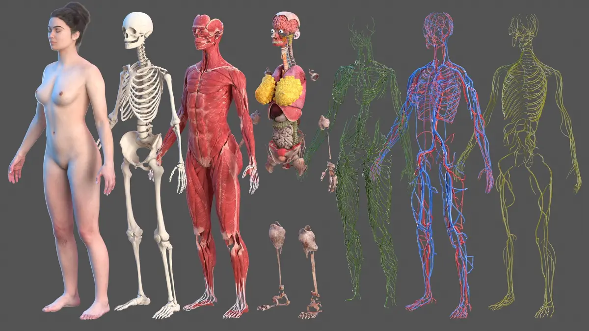 Full set of woman body anatomy visual educational materials with nervous system, blood vessels and lymphatic vessels cardiovascular scheme, full body muscular system, and skinned full body female person anatomical visual educational material.