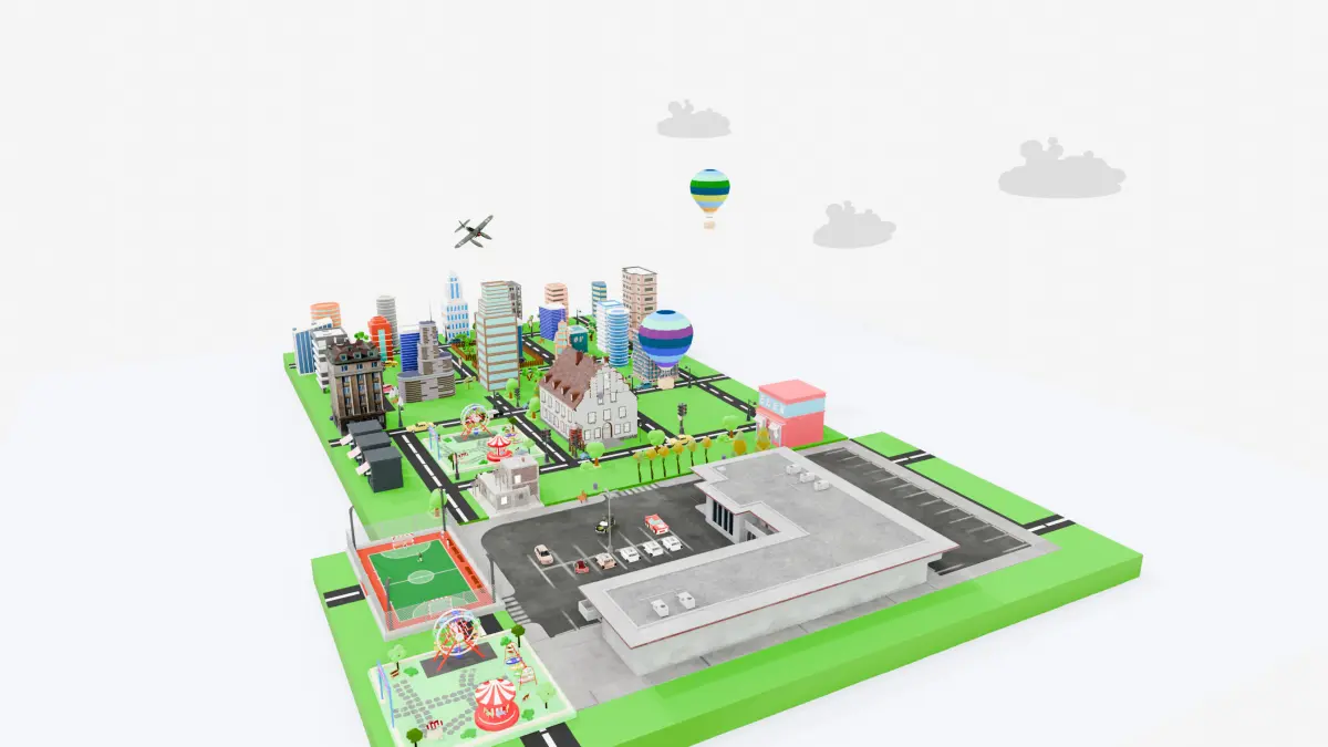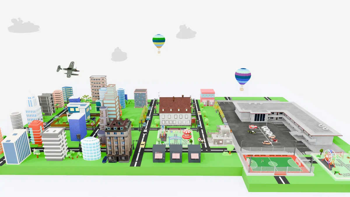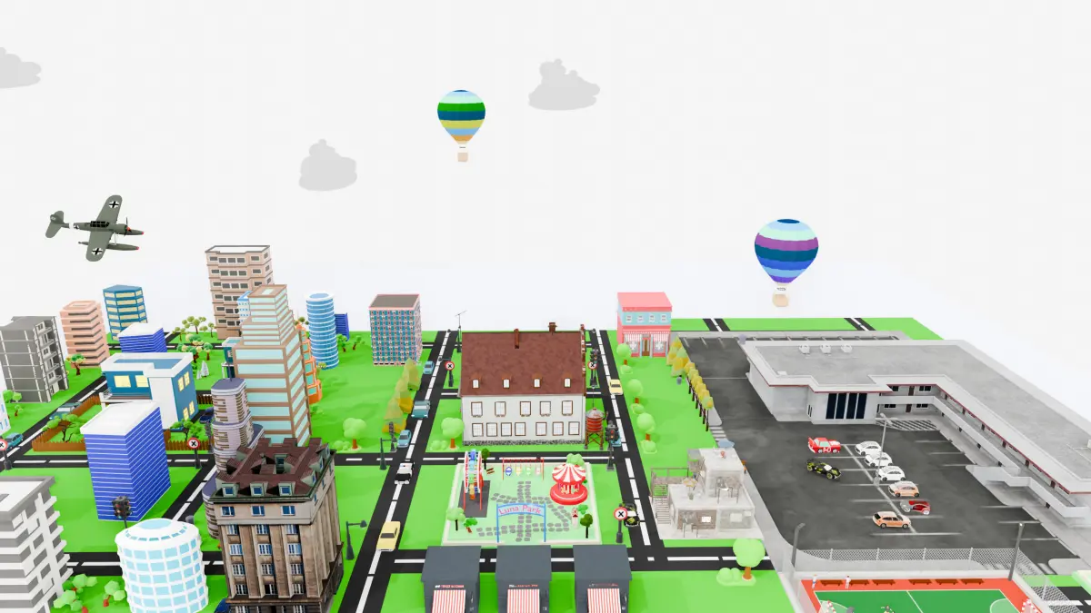 This is a complete low-poly city pack designed for game development and real-time applications. The pack includes over 30 optimized assets, all exported in FBX, OBJ, and USD formats with textures and materials included. All models are game-ready, lightweight, and suitable for mobile and PC projects.Included Elements:Residential and Commercial Buildings: 18 various designs (low-poly skyscrapers, apartments, modern houses)Police and Emergency Station: 1 large facility with parking area and vehiclesPublic Park & Festival Area: 1 central park with tents, circus, and fair ridesFootball Field: 1 fenced soccer field with animated charactersPlayground & Ferris Wheel: 1 complete children zoneAir Units: 1 WW2-style airplane, 2 hot air balloonsTraffic and Road Network: Road tiles, traffic lights, trees, and street signsMarket Stalls: 3 animated kiosks with striped canopiesMiscellaneous Props: Cars, food stands, fences, signs, benches, etc.All elements are modular and can be reused or expanded in other city or urban projects. Perfect for simulation, city-building games, education, or VR environments.