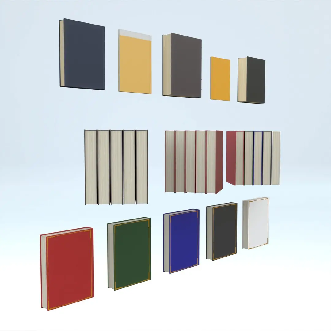 3D model collection featuring a complete set of hardcover books in various styles, colors, and design approaches.