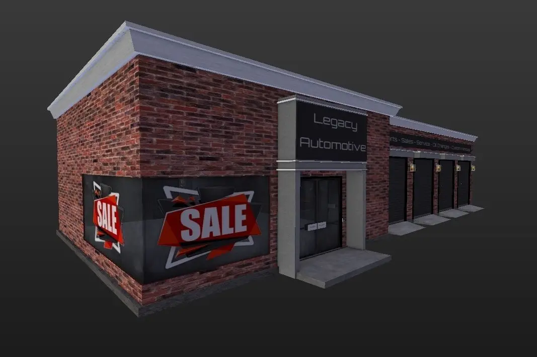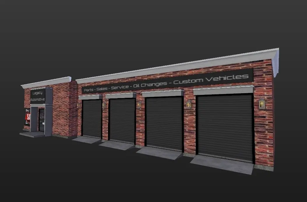 Complete Legacy Automotive Shop Low poly - origionally crafted for Secondlife so all animatable textures like on the garage doors, are included.Don't know alot about specs and details as this is only my second upload to CG Trader.