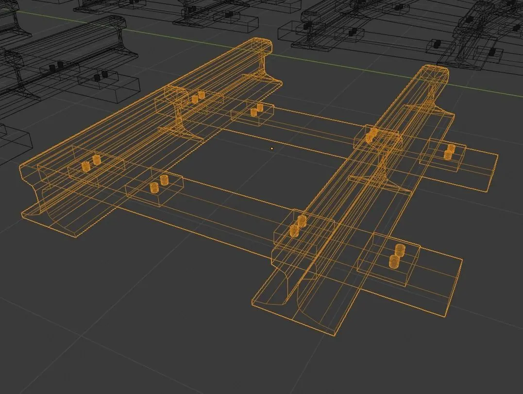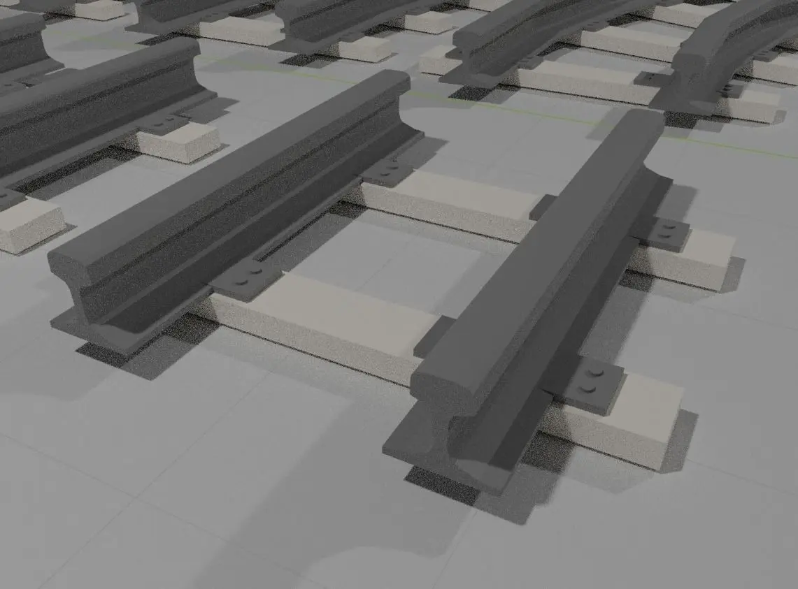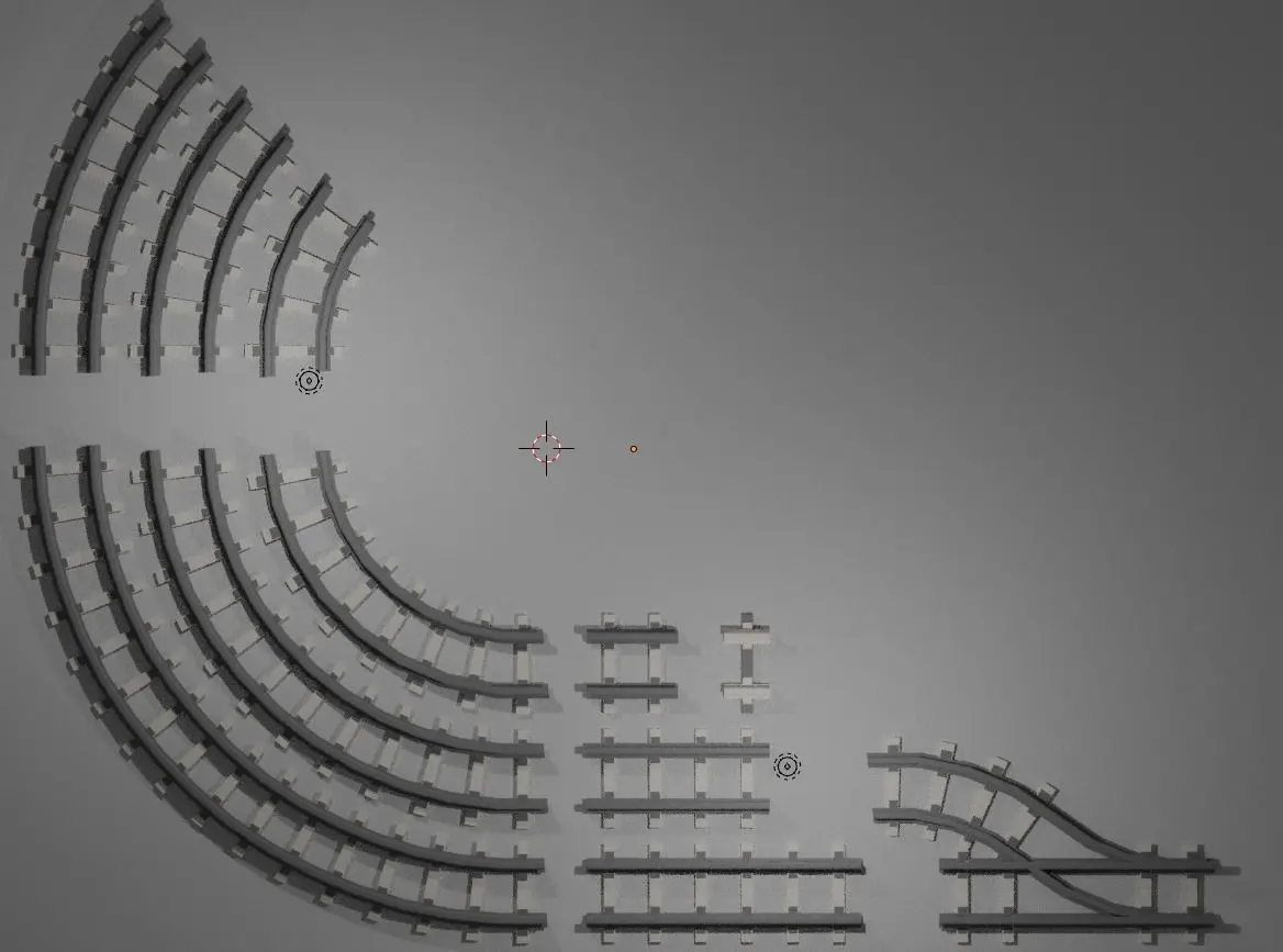 A complete rail set with separated 2 materials (steel and wood). The rails (11) are curved at 3x45 degrees , 3x90 degrees, 4xH and 2 to 1 junction. The rail is real-life size.