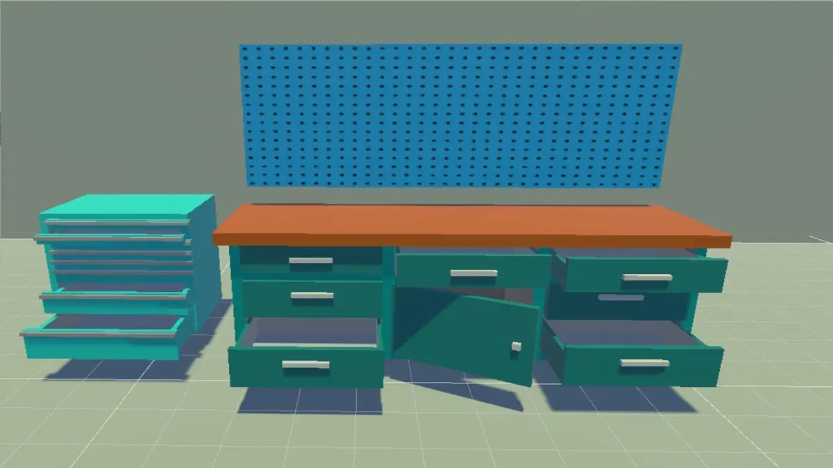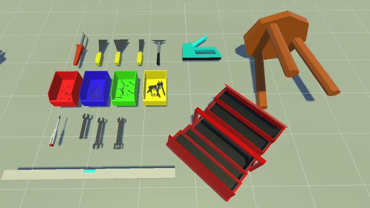 Create realistic and immersive workshop environments with this comprehensive collection of low-poly tools. Featuring a wide variety of tools, equipment, and workshop essentials, this asset pack is perfect for a variety of game genres, including simulation, adventure, and strategy games.Assets included:Angle grinderAxeBattery drillBolts (2 variations)Brushes (3 variations)Cables (2 variations)Cable tiesCarpenter's angleChainsawChiselCombination pliersCompressorCuttersCutter knifeCutter cleanDremelDrill boxDrilling machineDuct tapeFileFine sawFlat nose pliersFoxtail sawGrinding machineHammerHedge trimmerJigsawLadderLeaf blowerMetal sawNails (3 variations)NutPaint rollerPencilPincersPipe wrenchPlane slicerPlaster moldPlugs (Europe and USA)PlungerRatchet tool attachmentRatchet tool extensionRatchet toolRivet gunRulerSafety gogglesSandpapers (2 variations)SawScrew clampScrewdrivers (4 variations)Side cuttersSledge hammerSocket wrenchSoldering ironSpatels (4 variations)Staple gunStoolStorage boxTail plugTape measureTapeTool cabinet (with 4 drawers and clean version)Tool case (with multiple compartments, covers, and clean version)Tool wallTrowels (3 variations)ViceVoltage tester screwdriverWater levelWorkbench (with clean, door, and drawers versions)Wrenches (3 variations)All assets are optimized for performance without sacrificing visual appeal. They are also carefully designed for seamless integration within the Unity engine, ensuring ease of use and compatibility.With this asset pack, you can create stunning and engaging game experiences that will impress your players.