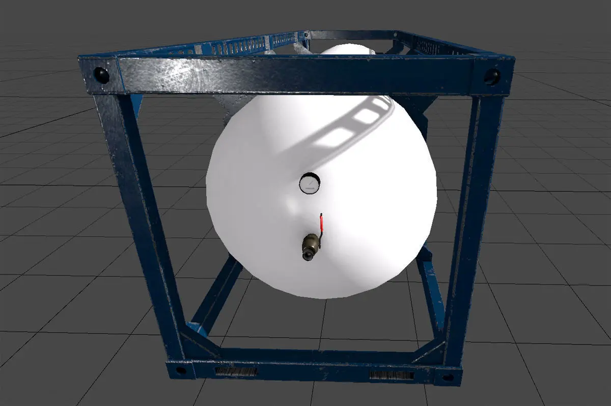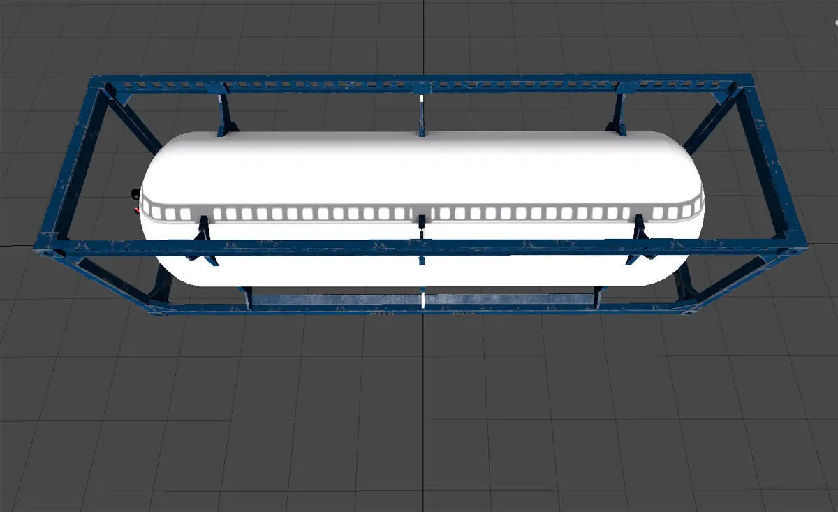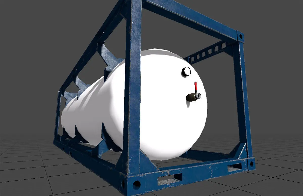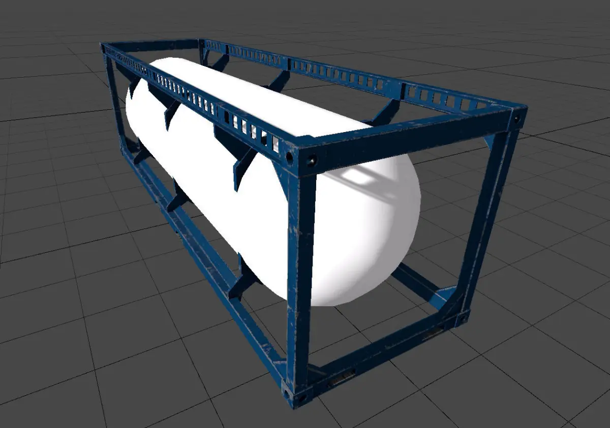 This is a Compressed Gas tank that I made as cargo for a game I'm making. It is 9x2.8x2.6 meters (30x9x8.5 feet), the tank volume would roughly be 37000 liters or 10000 gallons.