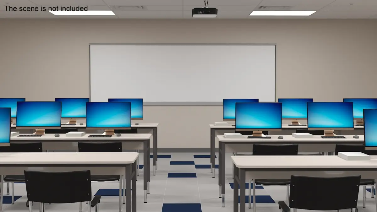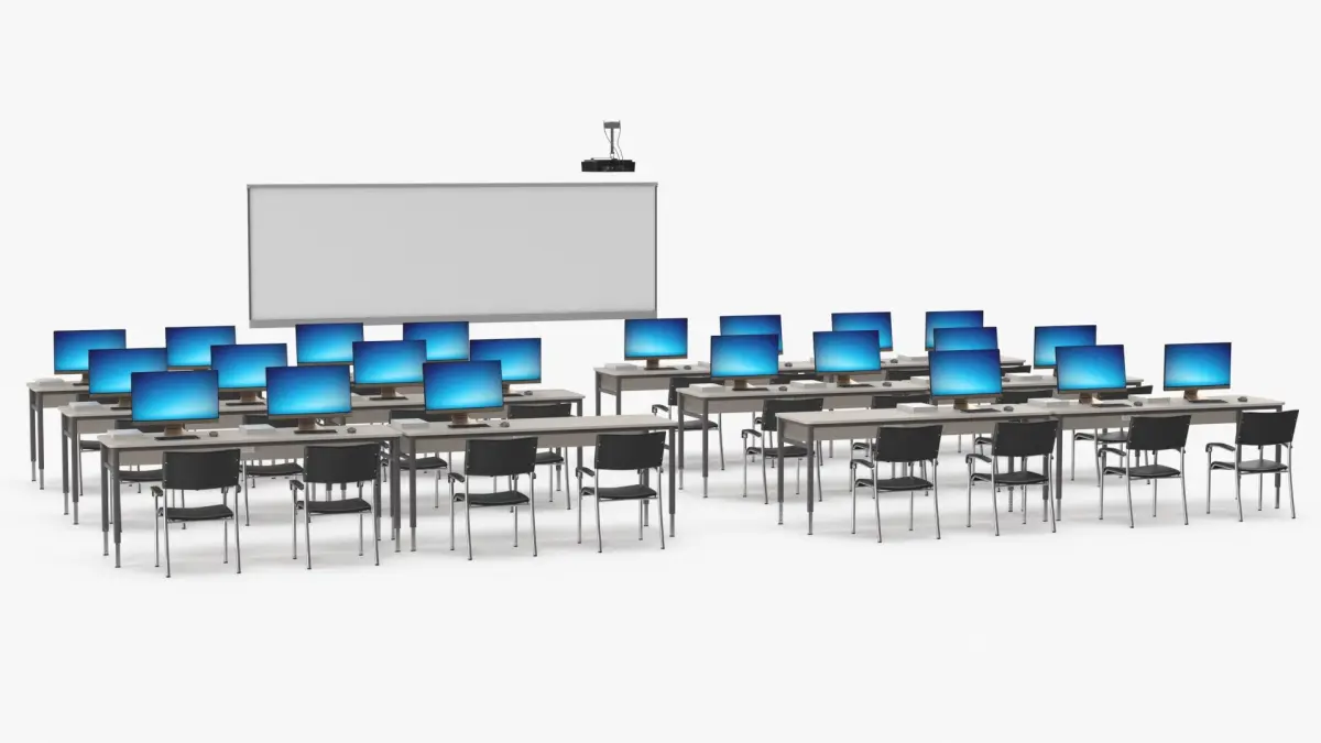 Computer Classroom Setup is a three-dimensional model of educational technology infrastructure designed to optimize learning environments with integrated computer workstations.