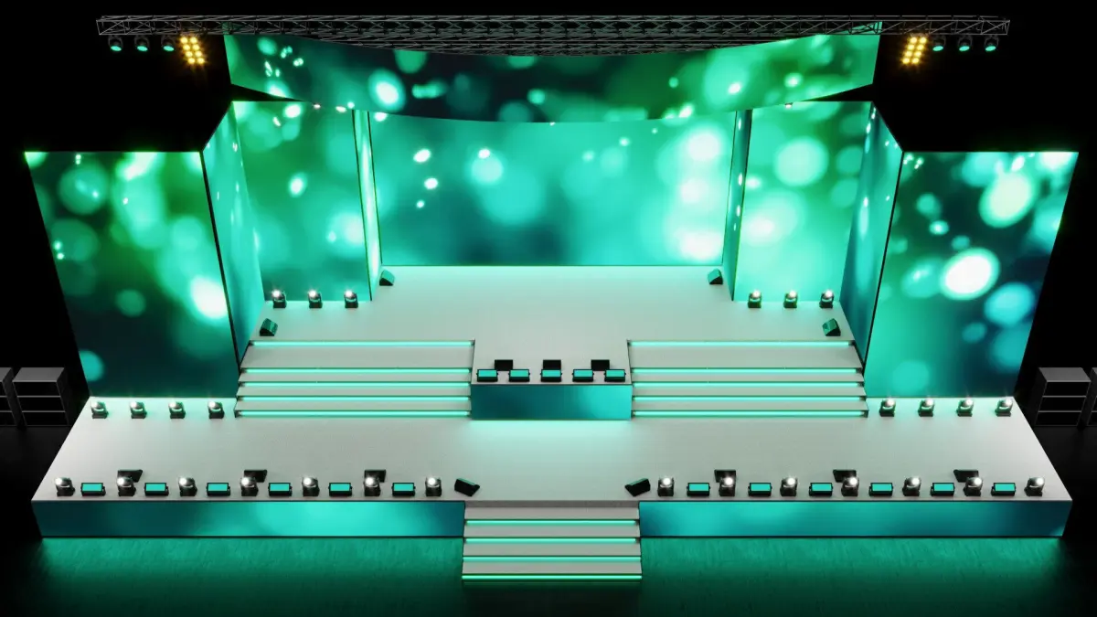 The file contains a stage design model suitable for many events such as concerts, congresses, meetings and seminar events. You can edit any image you want for LED screens from the material editor. The model includes only the LED screen, stage. Sound and lighting system models are not included. If your project requires sound and lighting systems, you can visit my profile to find and purchase the relevant models and integrate them into your project . I also offer you printouts in extra formats.