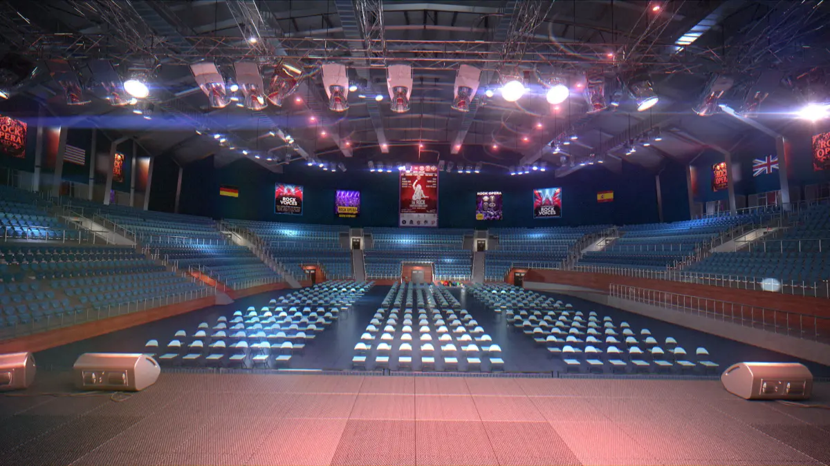 Layout: Grand indoor arena setup with a central stage, tiered stadium seating, and floor seating area.Stage: Elevated performance stage with lighting trusses, side speaker arrays, and curtain backdrops.Seating: Includes modular audience seating – fixed seats in the stands and folding chairs on the arena floor.Lighting: Suspended rig lighting system with emissive elements, replicating real-world concert lighting.Posters & Banners: Custom posters for events like “Rock Opera” and international flags enhance realism and atmosphere.Entrances/Exits: Multiple stairways and access routes modeled for functional realism.