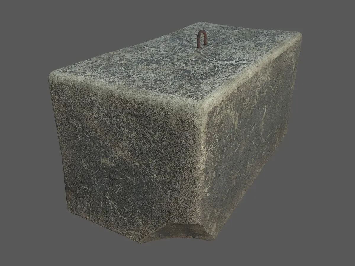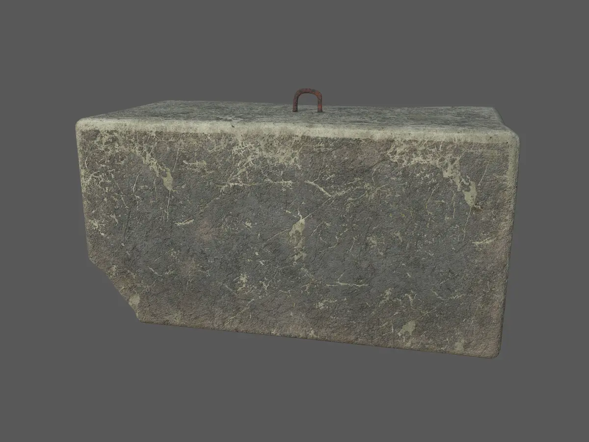 Game/VR/AR-ready low-poly model of a worn and cracked concrete block with a piece of rusty rebar sticking out of it that is used to lift and move the block. The model has 4K PBR-textures and is built to real-world scale (metric system).