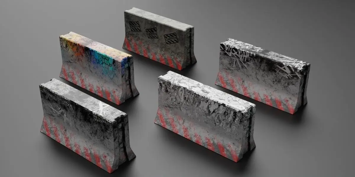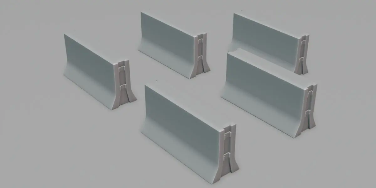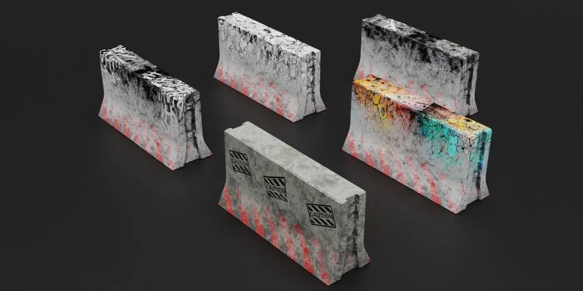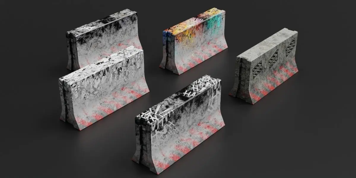 concrete blocker, fully textured, low poly models, modelled in Blender 3.2.0. Available in blend, OBJ, FBX, stl, and DAE format. Blend-file is ready to render in cycles. UVs are unwrapped and non-overlapping. Suitable for animation, still rendering or as game asset.