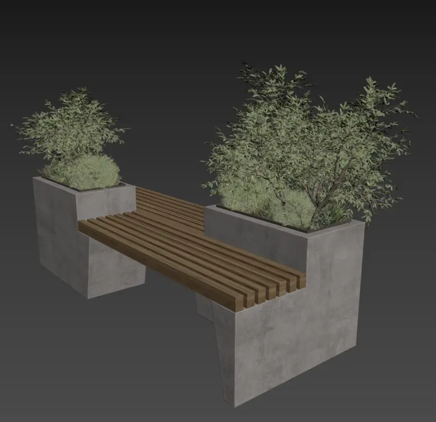 Contrasting the concrete foundation, the seating surface and backrest are thoughtfully constructed from rich, warm wood. The wooden elements bring a touch of nature to the design, infusing the bench with a sense of warmth and inviting charm. The wood grain is carefully detailed, adding a tactile dimension to the 3D model and contributing to the overall realism.