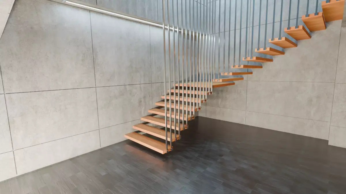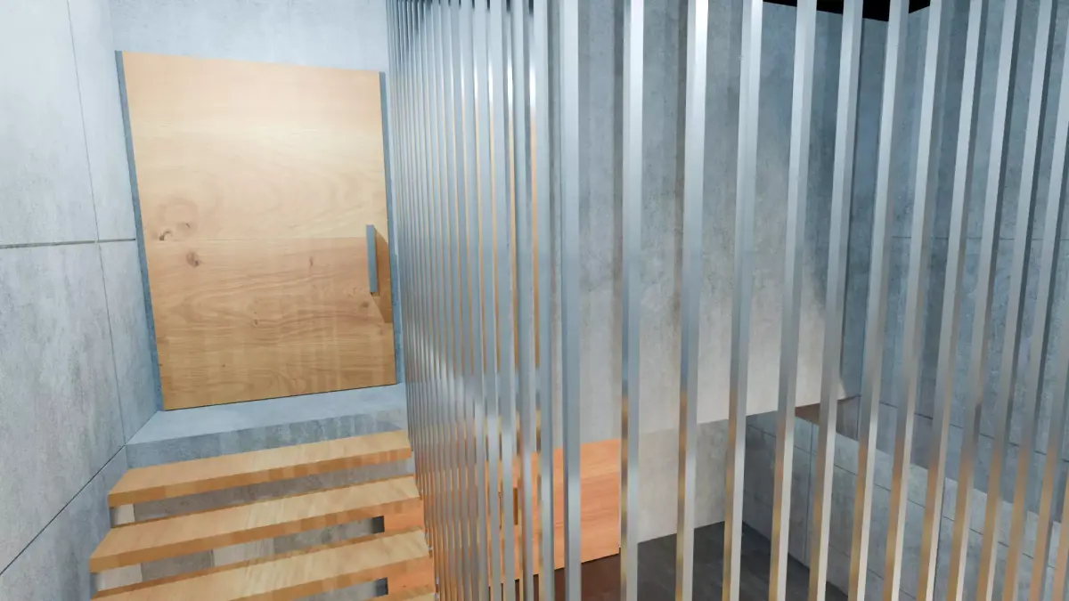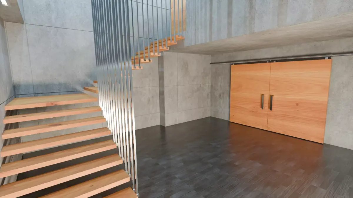A complete modern concrete interior, carefully designed for a stylish, minimalist hall. Features integrated wooden sliding doors, open staircase, and a **dark floor for contrast. Uniquely placed windows bring natural light and character to the space. Optimized for fast rendering and flexible integration, this open-plan interior is ready to use out-of-the-box.