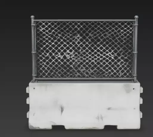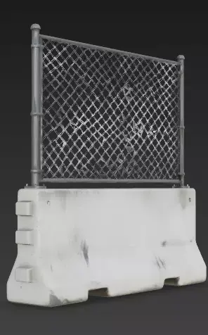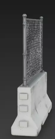The Overall Concept This asset is a hybrid security wall known as a Jersey Barrier topped with a fence. It combines the stopping power of heavy concrete with the height of a fence, making it the standard choice for securing construction sites or blocking off dangerous areas.