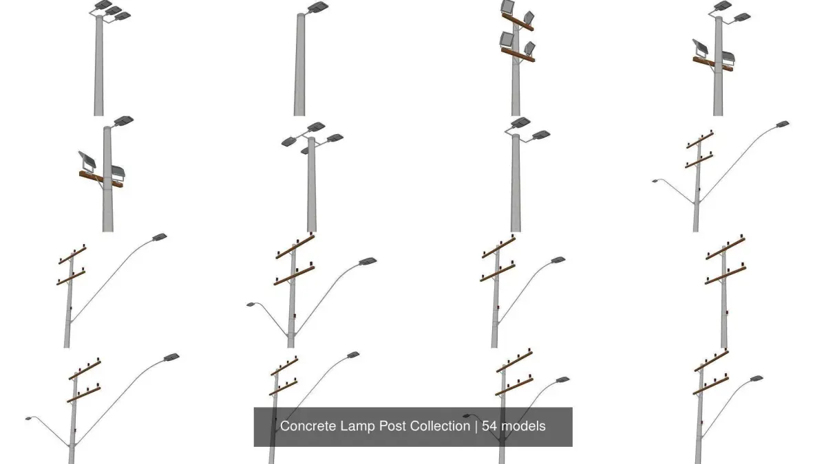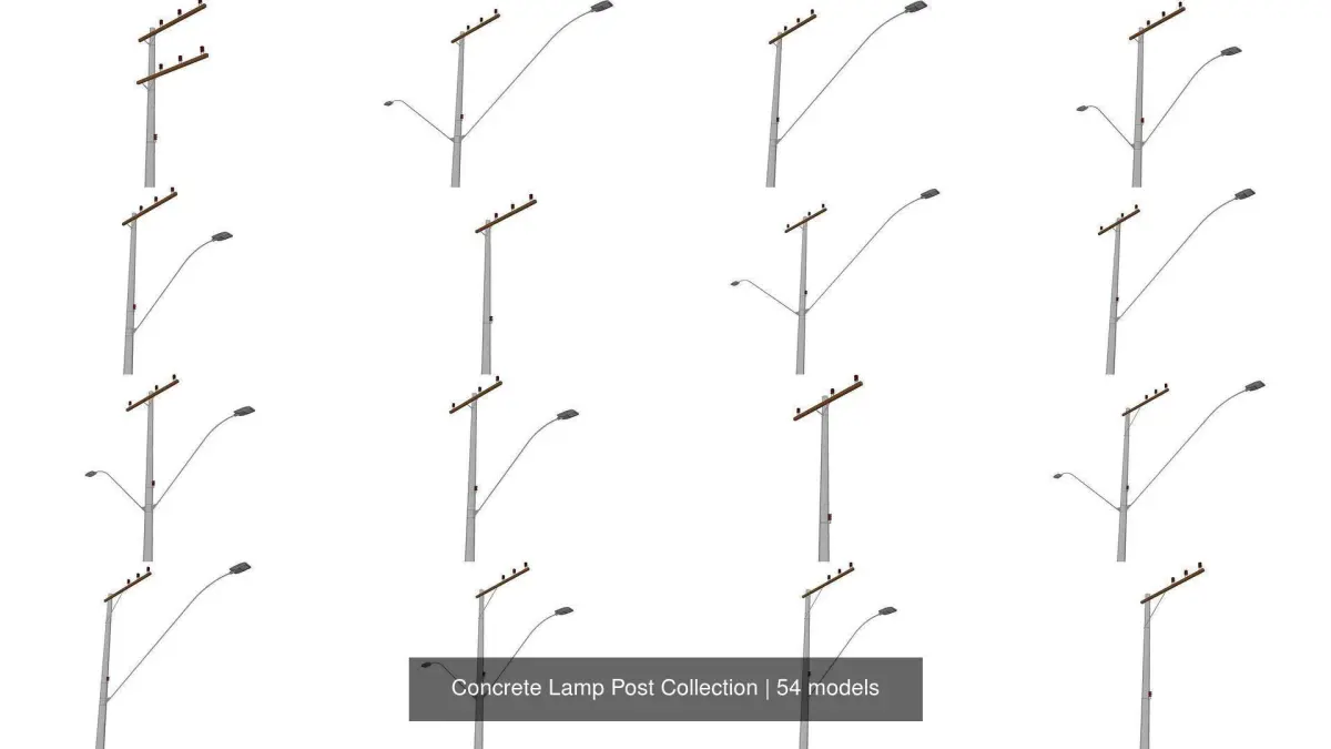 Different models of concrete lampposts, with different model sizes so you can use them however you want. These models were inspired by real lampposts from Brazil. Many other countries have similar models.