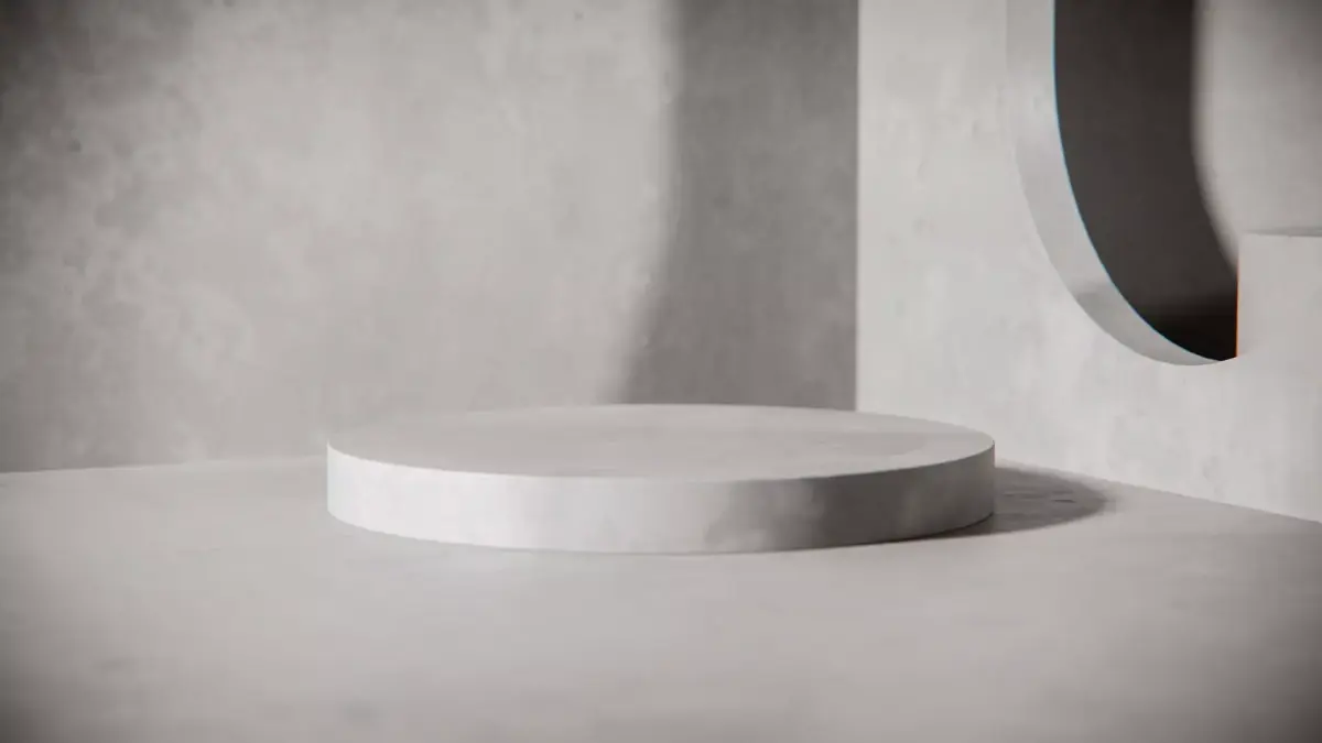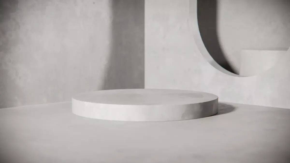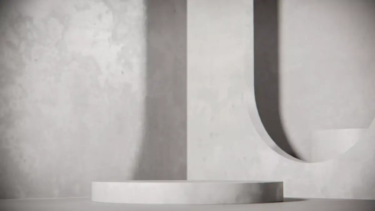 Empty grey concrete podium for product presentation. Minimalist 3D render background with geometric shapes and texture. Industrial style mockup for cosmetics, fashion, or advertising placement.