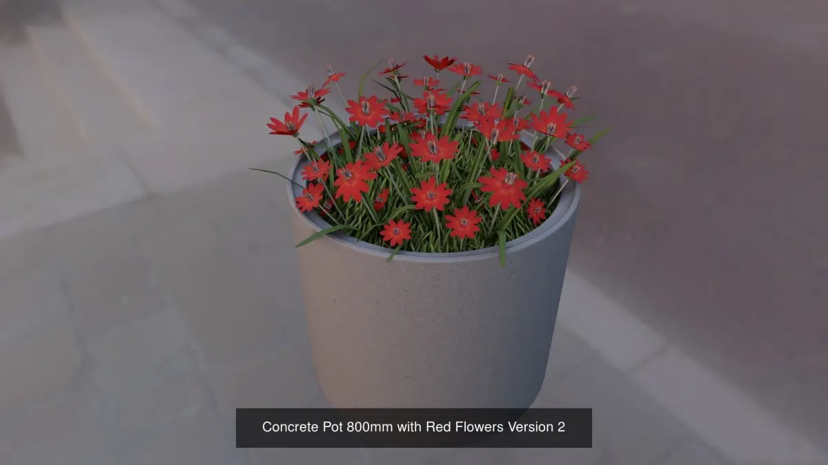 All concrete pipe pots with red flowers.