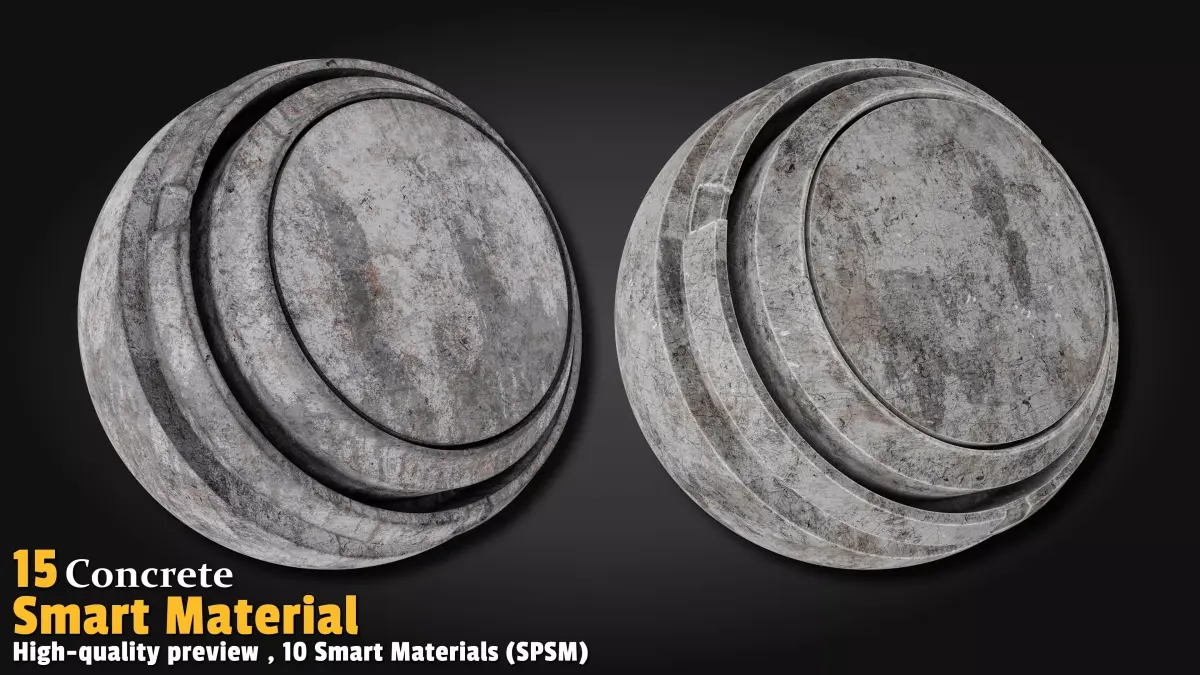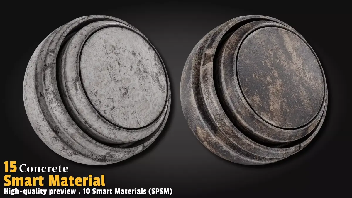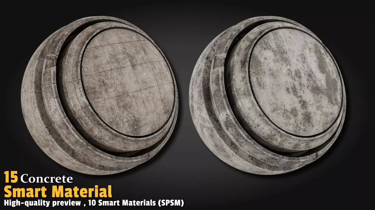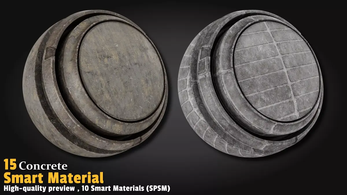 This pack features 15 high-quality Concrete Smart Materials (SPSM) fully crafted in Substance Painter version 11. Each material includes its own high-resolution preview in a dedicated folder. Simply Drag & Drop and instantly turn walls, floors, columns, or any structure into ultra-realistic, detailed concrete in seconds!