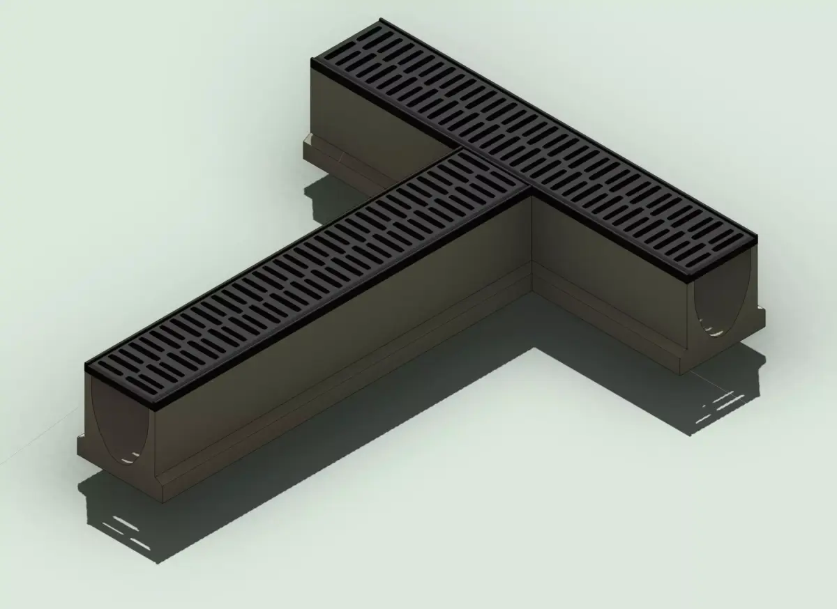 Concrete trench drain T junction module with slotted grate cover.This drainage element allows three trench drain channels to connect in a T-shaped configuration and is commonly used in urban drainage systems, parking areas, streets, and industrial environments.