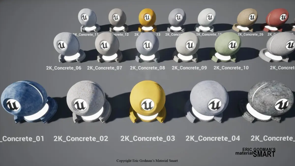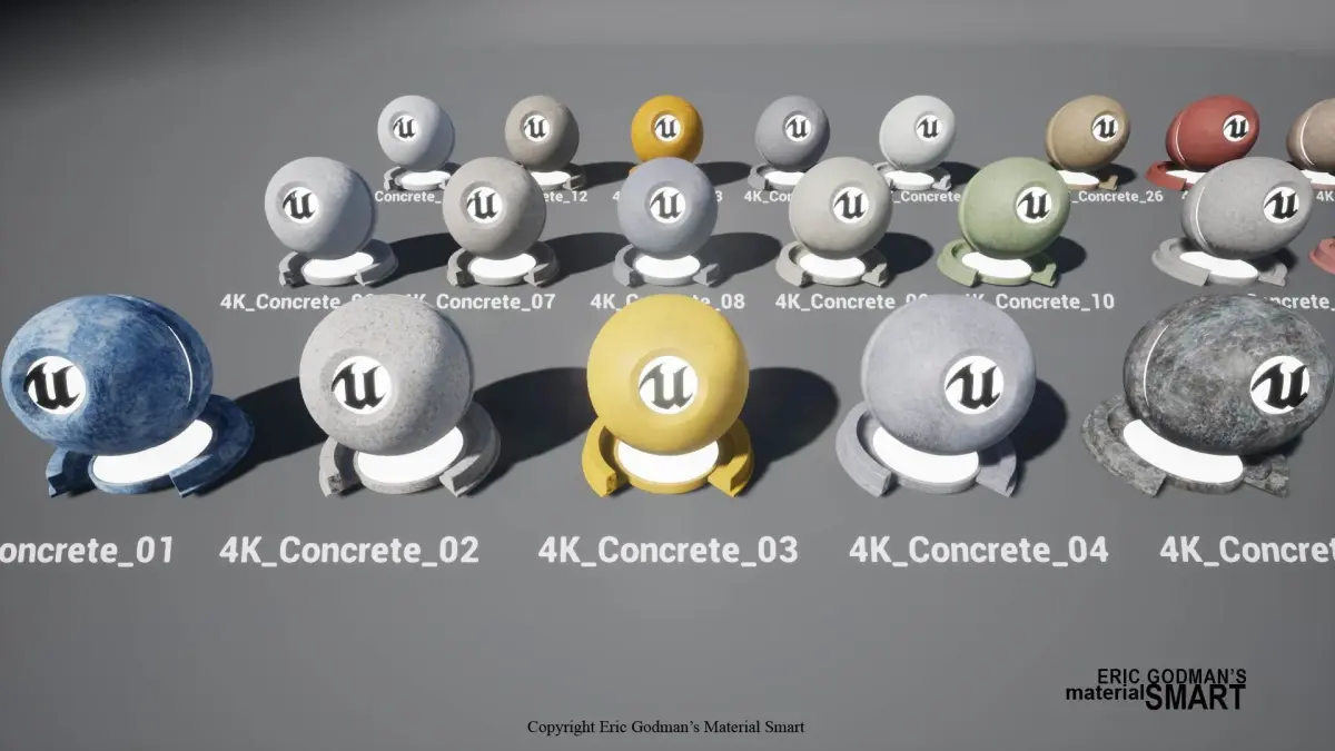 A Set of 60 material instances created with master materials from Material Smart: World Aligned Concrete Series, featuring full texture map customization, distortion, normal far field fall-off, and world aligned options for PC/Mobile development. Before you buy, please check the optimization version: Optimized Concrete World Aligned Materials: same featured materials with less than half texture loading capacity, treading off its full texture map customization options.This package contains a set of 60 smart material instances with full customization. 30 advanced/basic material instances for each PC/Mobile application developments. All material instances are created based on master materials from Material Smart: Concrete SeriesBasic material instances featuring: • BC, R, and N texture map options • Full UV optionsAdvanced material instances featuring: • BC, S, R, T, N, and AO texture map options • Full UV optionsAdditional functionalities featuring: • World Aligned toggle options on XY|XYZ|Z • Texture distortion and tessellation options • Normal map fall-off at far field option • Simple/advanced S/R texture map options • Individual UV options for all secondary texture mapsFor more concrete master materials, please check Material Smart: World Aligned Concrete SeriesFeatures: • 30 material instances for Mobile application development (Basic) • 30 material instances for mid-to-high end PC/console application development (Advanced) • 90 texture maps for Mobile material instances in 2048 resolution • 180 texture maps for PC/Console material instances in 4096 resolution • All texture maps replacement and fine-tune options • World aligned options on XY | XYZ | Z • Secondary Texture Distortion option can be toggled on/off • Tessellation options • Simple/advanced specular selection • Simple/advanced roughness selection • Normal map fall-off at far field option can be toggled on/off • Specular texture/specular simulated from roughness selectionNumber of Master Materials: 2Number of Material Functions: 9Number of Textures: 275Number of Material Instances: 60Documents: Source textures cite, and license can be found under the project folder at “Source Texture Cite & License”