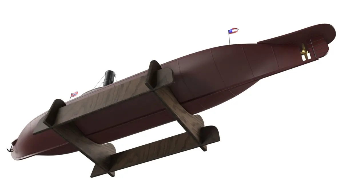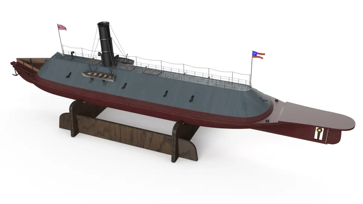 Confederate Navy Ship CSS Virginia on Stand is a 3D model of the famous Civil War ironclad warship, displayed on a wooden support base.