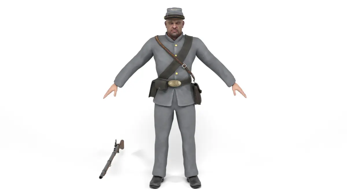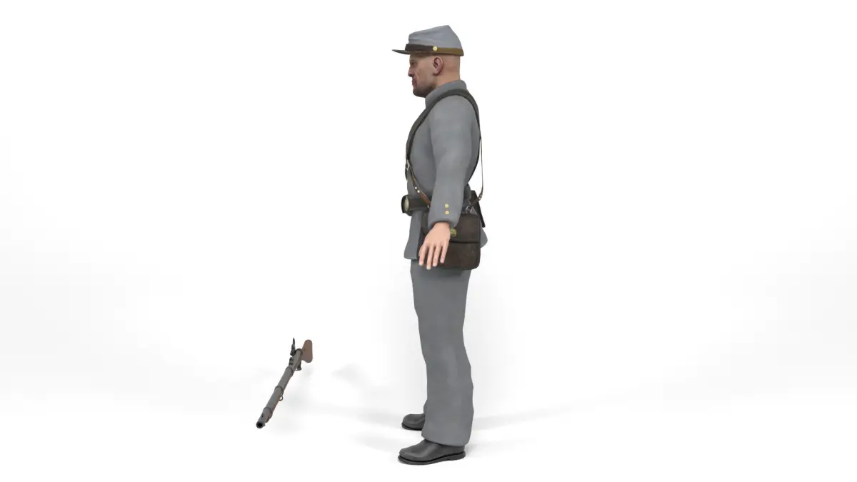 3D model of a Confederate soldier (American Civil War in the United States). Weapon included. The model includes bones and several animations. Model ideal to be used in games, advertising and video production. Low-poly models to be used easily in any project.