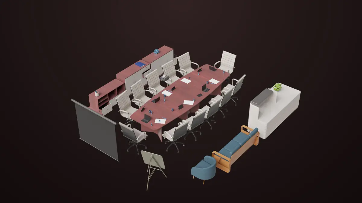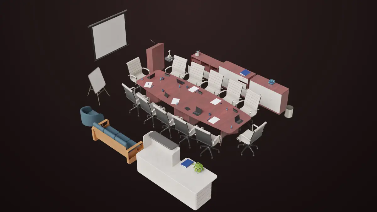The Photorealistic 3D Model of Conference Hall Props Collection. This model is suitable for any visual production - broadcast, high-res film close-ups, advertising, games, design visualization, forensic presentation, etc