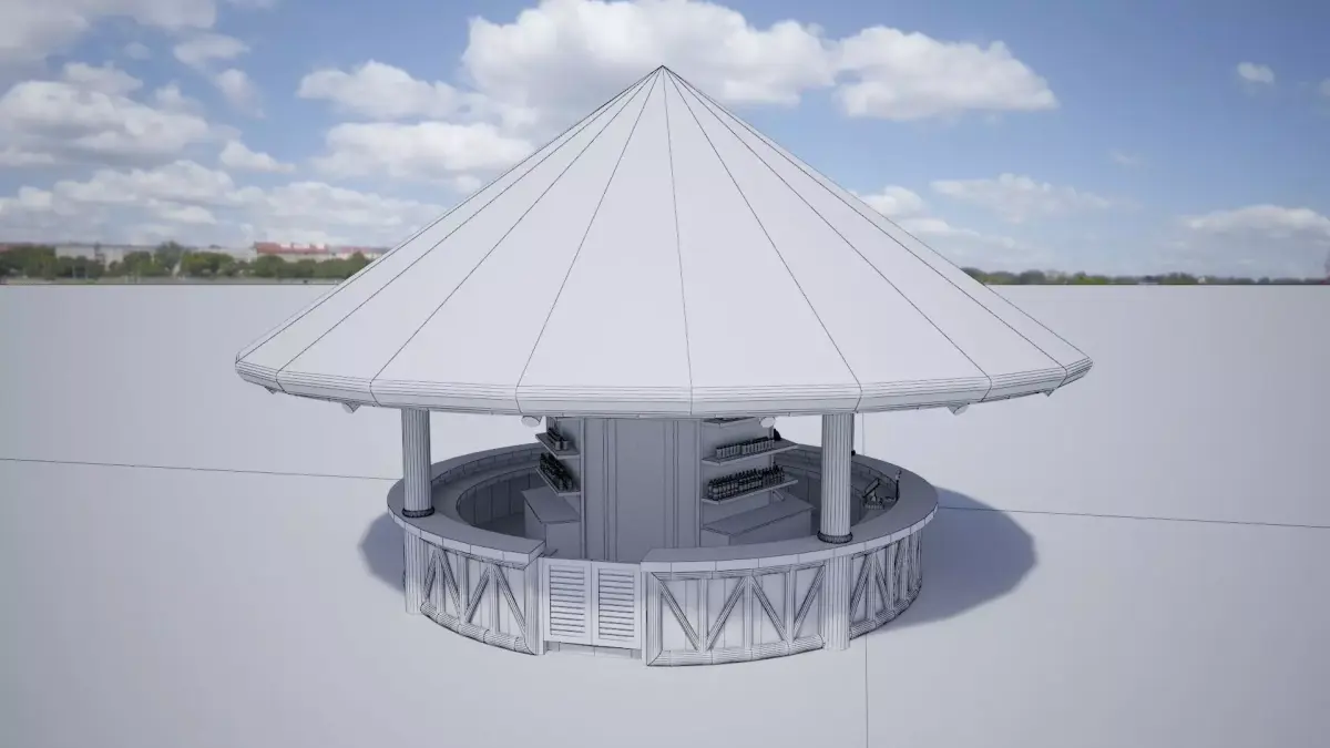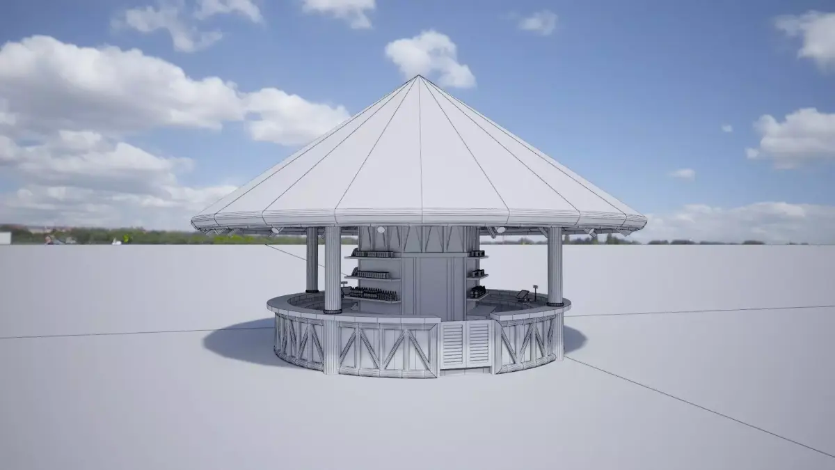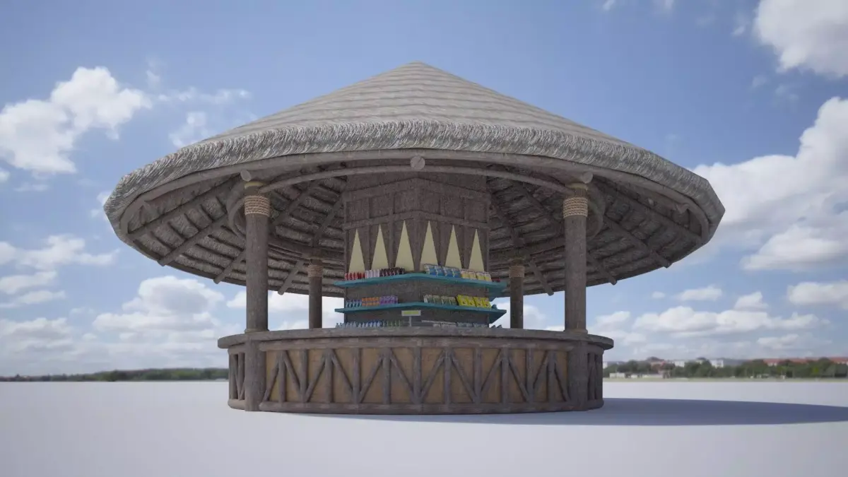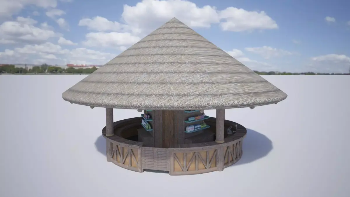 A design of conical thatch roof pavilion bar in wooden tropical style for resort or waterpark. Size: Diameter 10m, high 6.5m