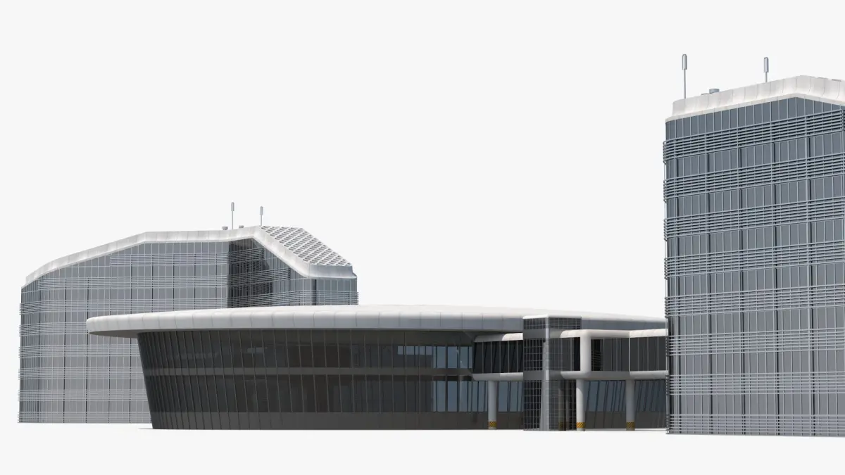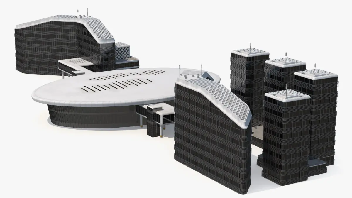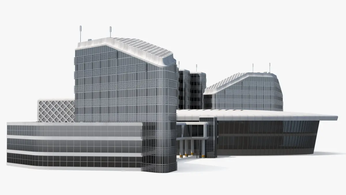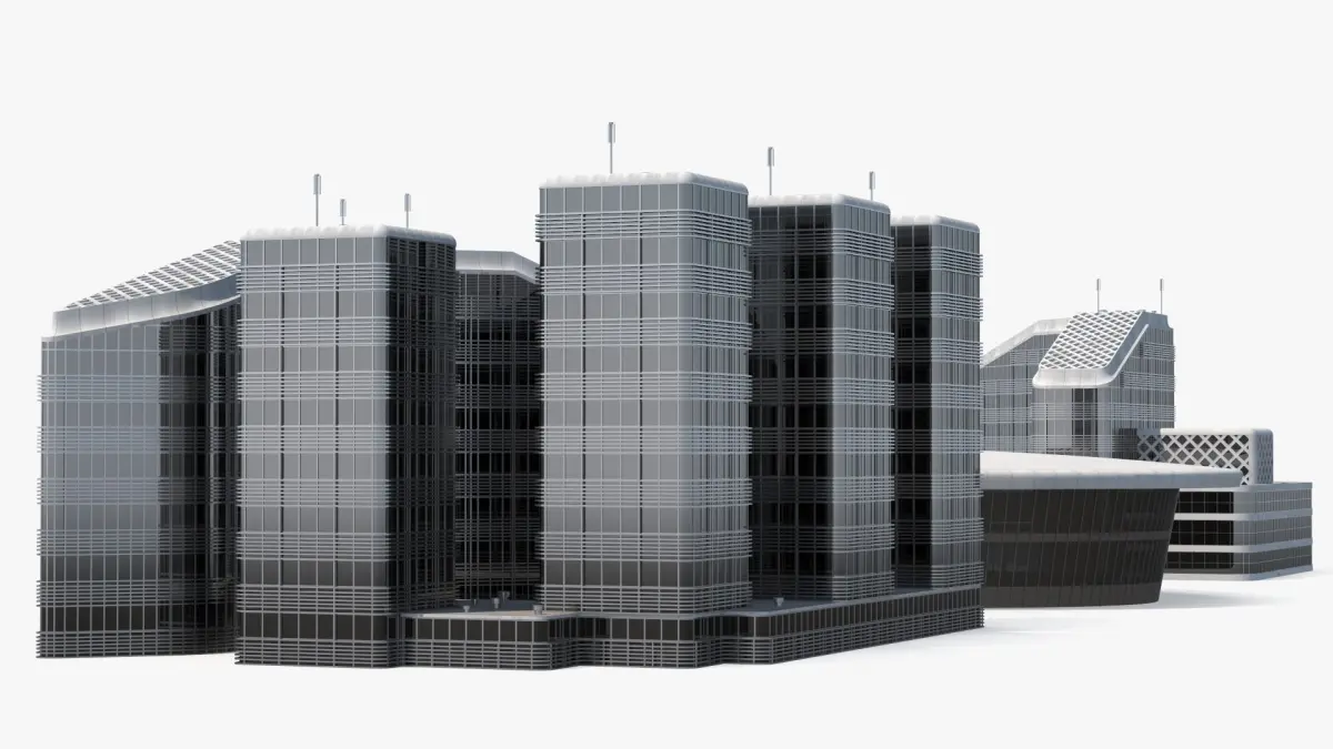 Connected Urban Building Complex Concrete is a three-dimensional model of set of modern office buildings featuring contemporary architectural design, characterized by urban glass facades and minimalist aesthetics.