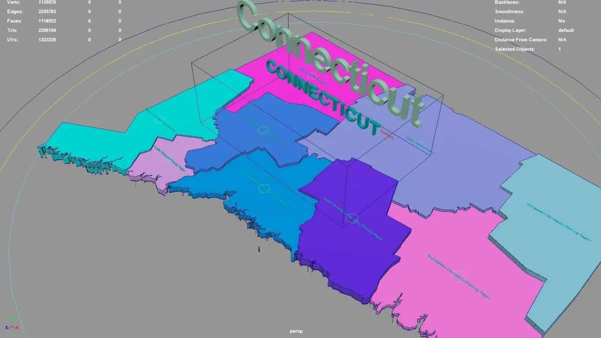 Connecticut regions : The model is divided according to the administrative region of Connecticut. Each region is clearly separated so you can easily isolate it or change the colors. Names are also editable and separate.