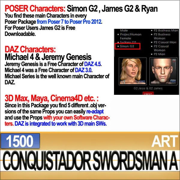 PROPS SET for POSER-DAZ Standard Characters. CHARACTERS NOT INCLUDED. [DAZ is a free Software]._______________________________________Conquistador Swordsman A 42 HD props. All 3D models for POSER James, Simon G2, Ryan and free DAZ Michael 4, Jeremy Genesis. Faithful Reconstruction. C4D, 3DS, OBJ, POSER, DAZ, VUE6to12!_______________________________________Conquistador Swordsman A.Props Set for Conquistador Officer or Commander and for Conquistador Swordsman Soldier.4 Conquistador Helmets, 4 Armours, 4 Swords to build more than 9 different Conquistador Outfits.