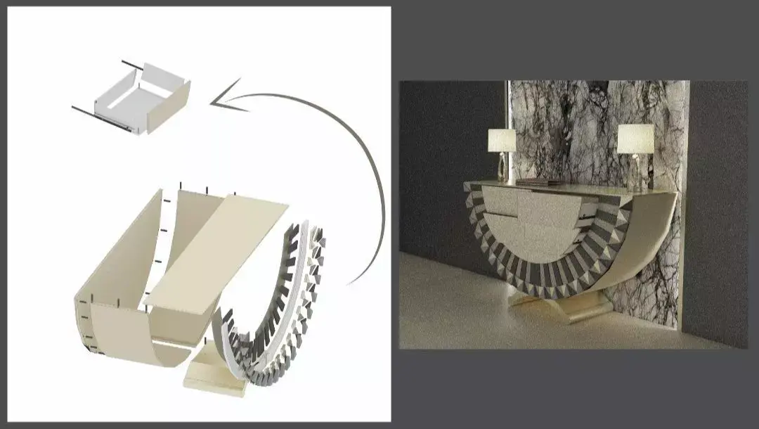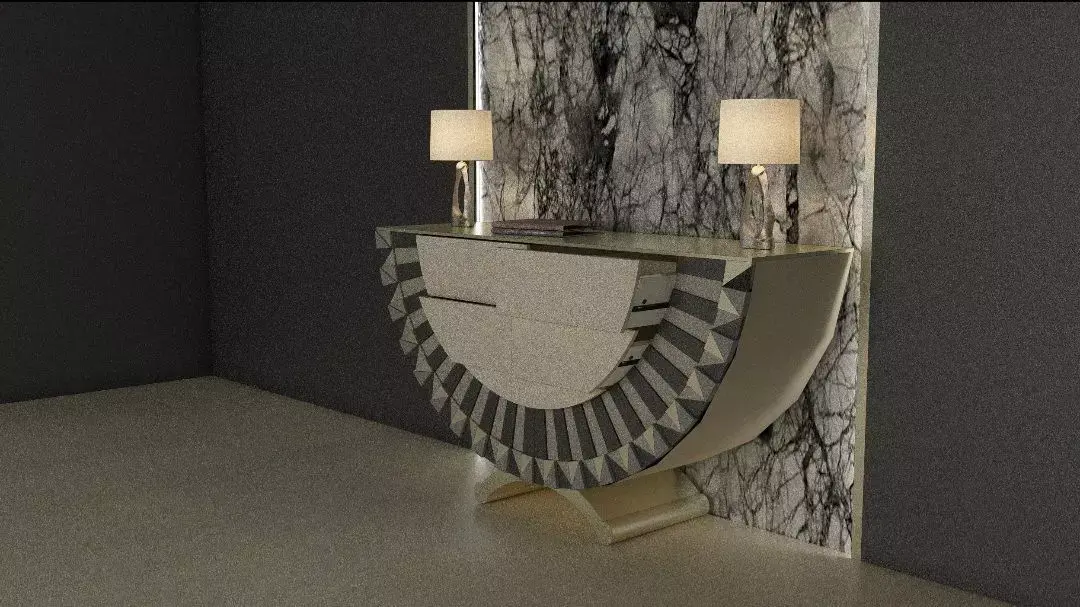 A detailed console table crafted with your signature method, designed in a refined blend of organic and Art Deco styles.A detailed console table crafted with your signature method, designed in a refined blend of organic and Art Deco styles.