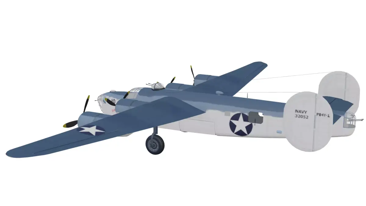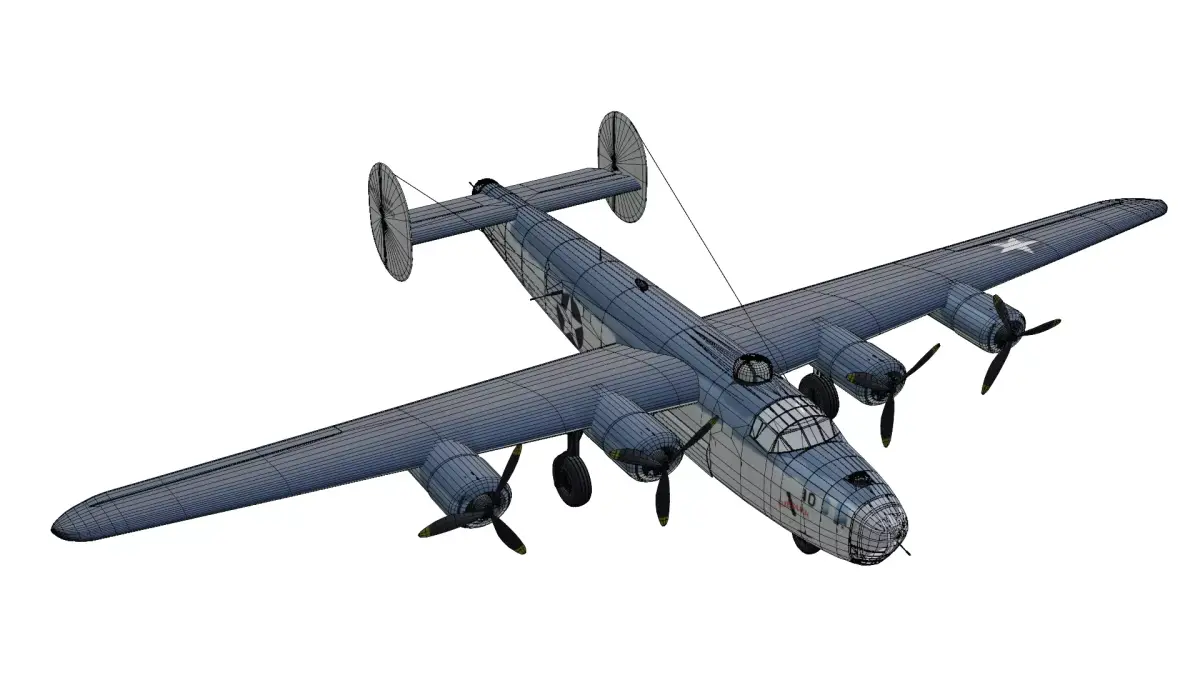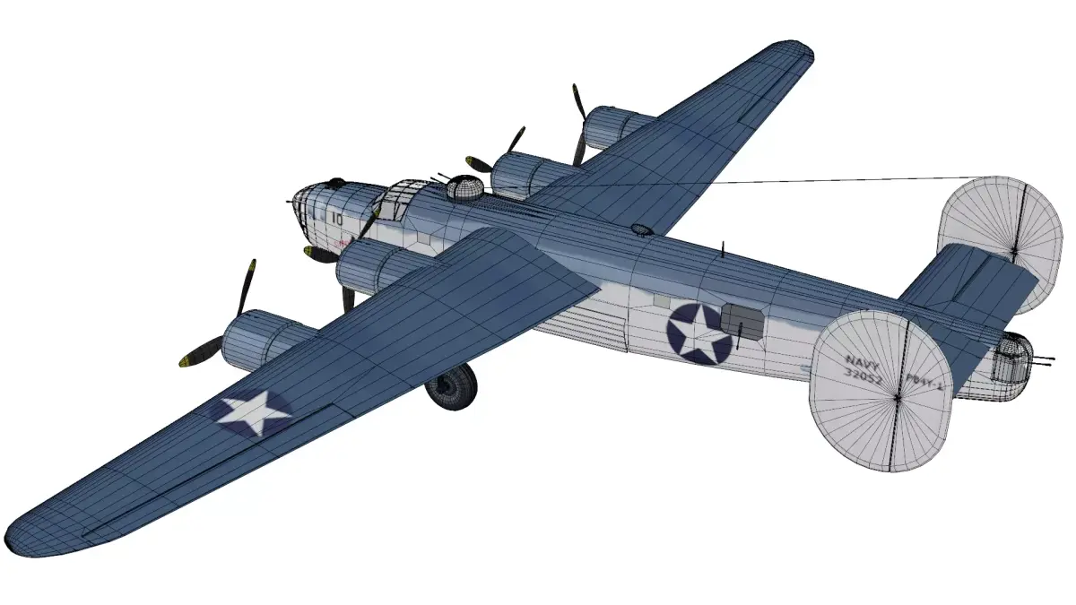 The Consolidated B-24 Liberator is a high quality, photo real model that will enhance detail and realism to any of your rendering projects. This model captures the heavy, slab-sided design of the most-produced American military aircraft in history. It features its signature shoulder-mounted Davis wing, twin tail fins, four powerful radial engines, and authentic World War II United States Navy livery.The model has a fully textured, detailed design that allows for close-up renders. Renders have no postprocessing.