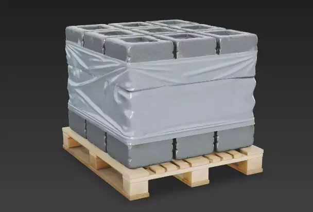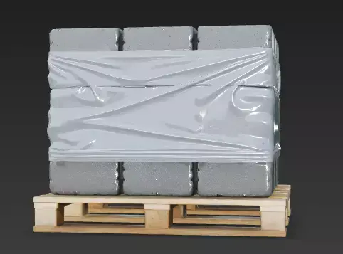 Plastic Wrap Detail The blocks are secured with clear plastic shrink wrap. This wrap has wrinkles, highlights, and folds that show it is stretched tight around the heavy load, adding a great layer of material contrast to the dull stone.