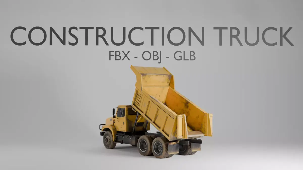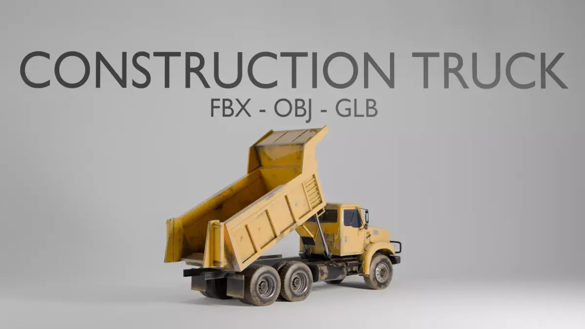 A semi-realistic heavy duty construction dump truck with a large boxy cab, prominent front bull bar, wide double rear axles, and a raised dump bed with hydraulic arms visible on the sides. Construction yellow colouring with mud and dirt weathering throughout, worn paint on the body and chunky industrial tyres. Ideal for scene dressing, background use, construction environments, cinematic renders, and decorative props.