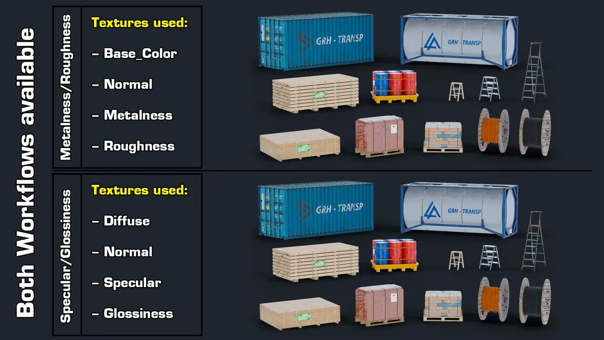 - Both Metallic/Rough and Specular/Gloss PBR workflows are available