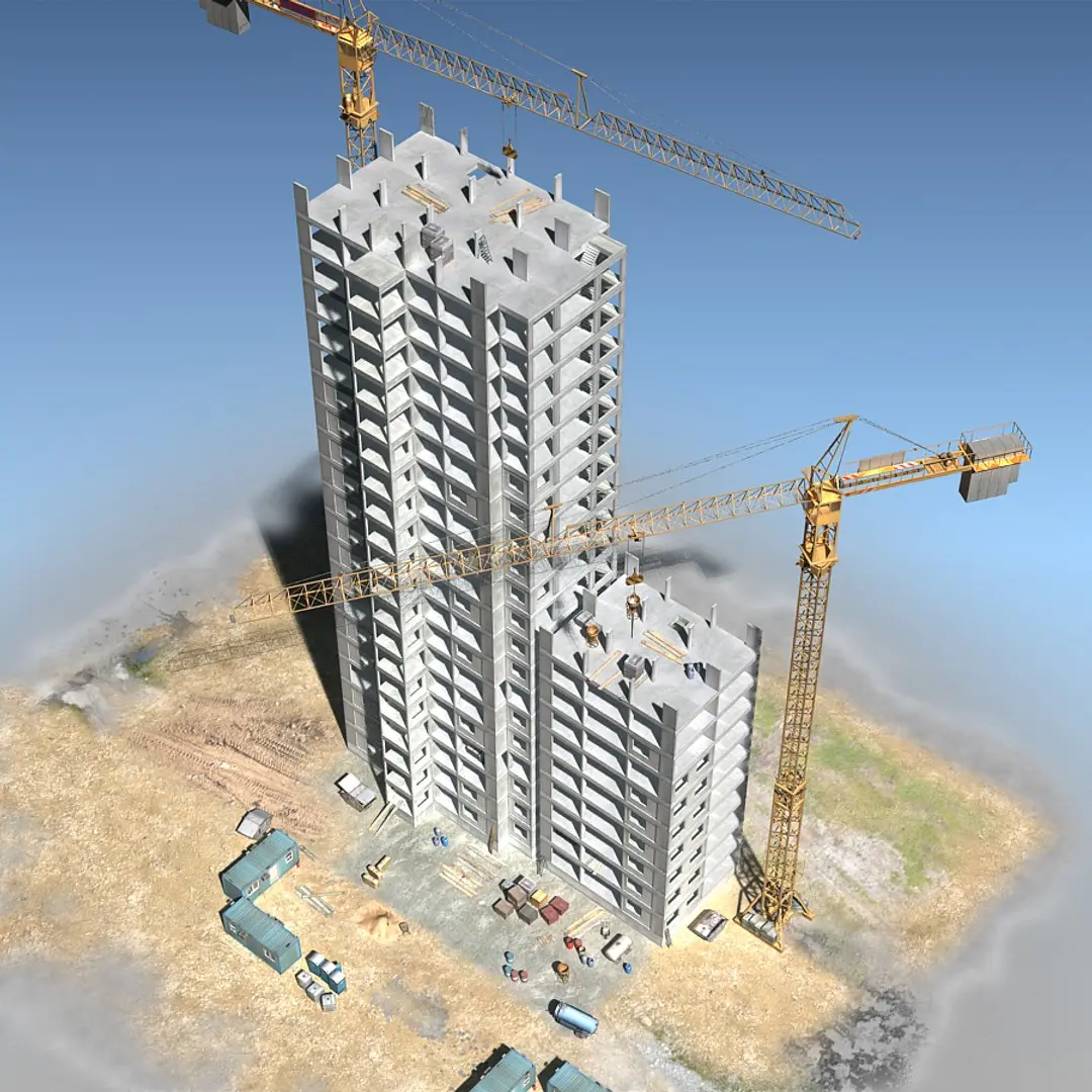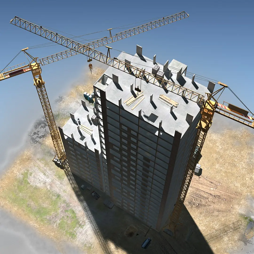 In this concrete construction set,included,: Basic modules with two builded construction and other construction elements,like: Tower crane,water tanks,office containers,garbage container,pallet & Loads,wheelbarrow,concrete bucket,liquid tanks,sand,shovel,mobile toilet,,etc... .This construction blocks can be used to add real-time city environments.