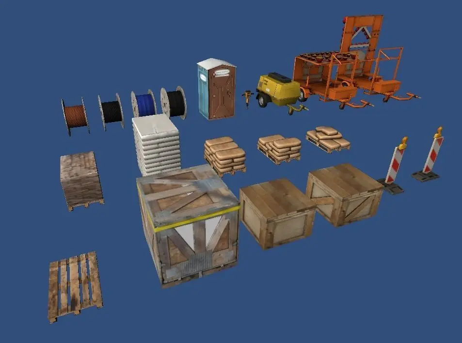 This package contains 21 hi-detail contruction site props.All textures were created including ambient occlusion. Some of them come with normal maps.Textures-sizes between 512x512 to 1024x1024.
