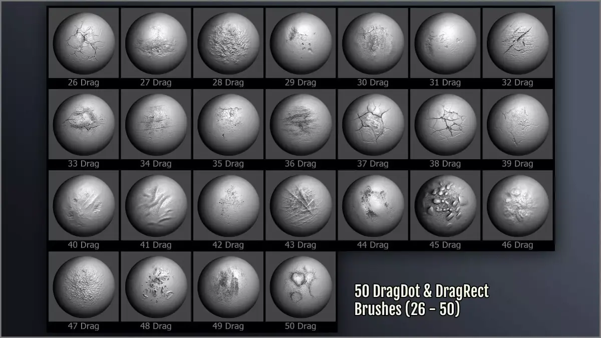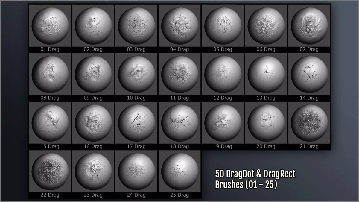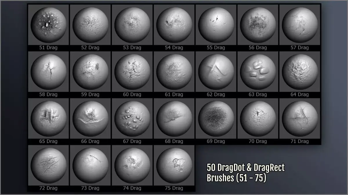 - 375 ZBrush brushes for relief, texturing, and polypainting: dragrect, dragdot, spray brushes, paint freehand brushes, and paint dragrect brushes.