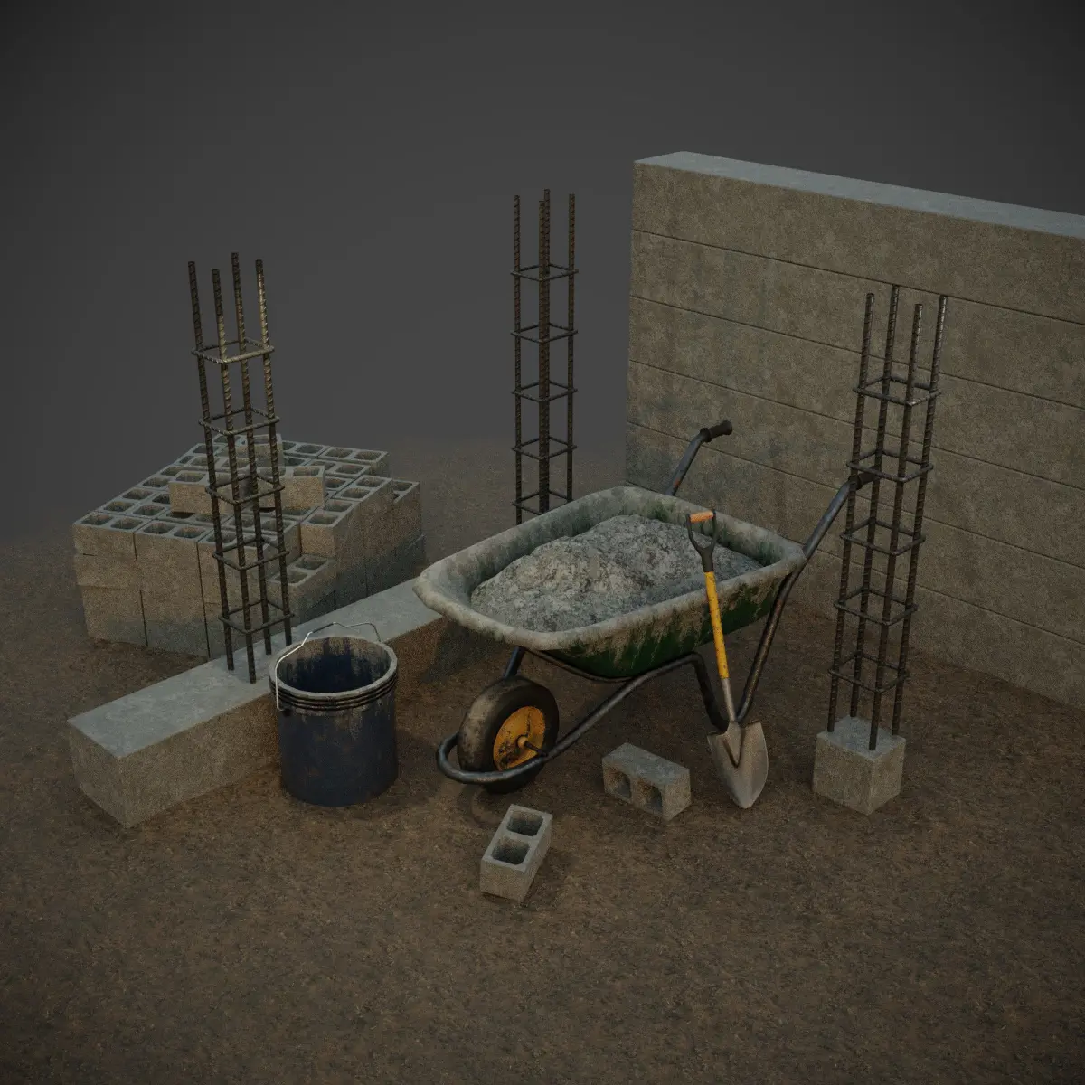 a wheelbarrowconcrete bars with rebar steela dirty bucked and a shovelall textured