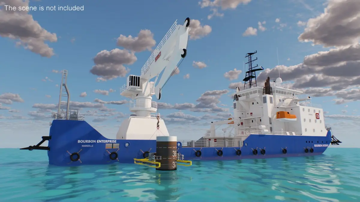 Construction Vessel and Offshore Subsea DWCM Cutter is a 3d model of a specialized maritime vessel equipped with a dynamic subsea cutter, designed for deepwater construction and maintenance tasks in offshore industries.