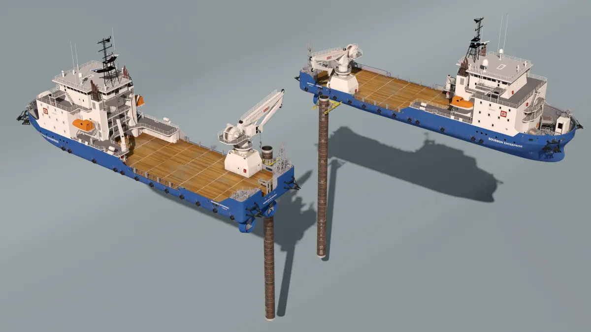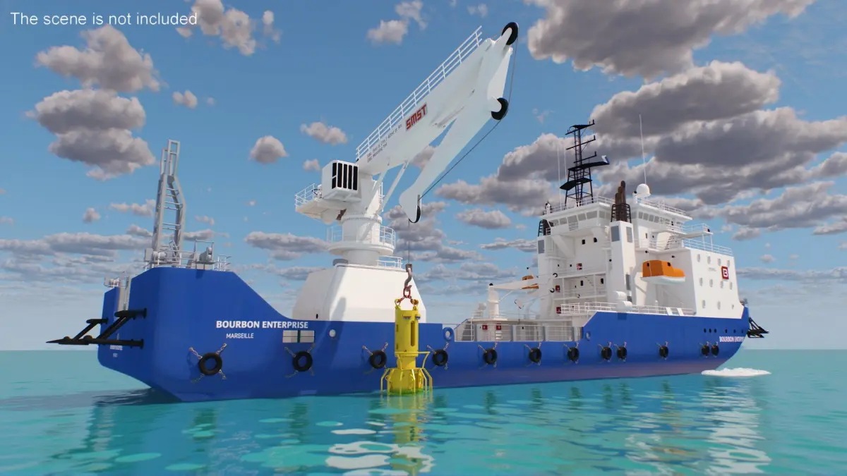 Construction Vessel and Offshore Underwater Pile Driver is a 3d model of a specialized marine construction ship equipped with advanced underwater pile-driving technology for offshore infrastructure projects.