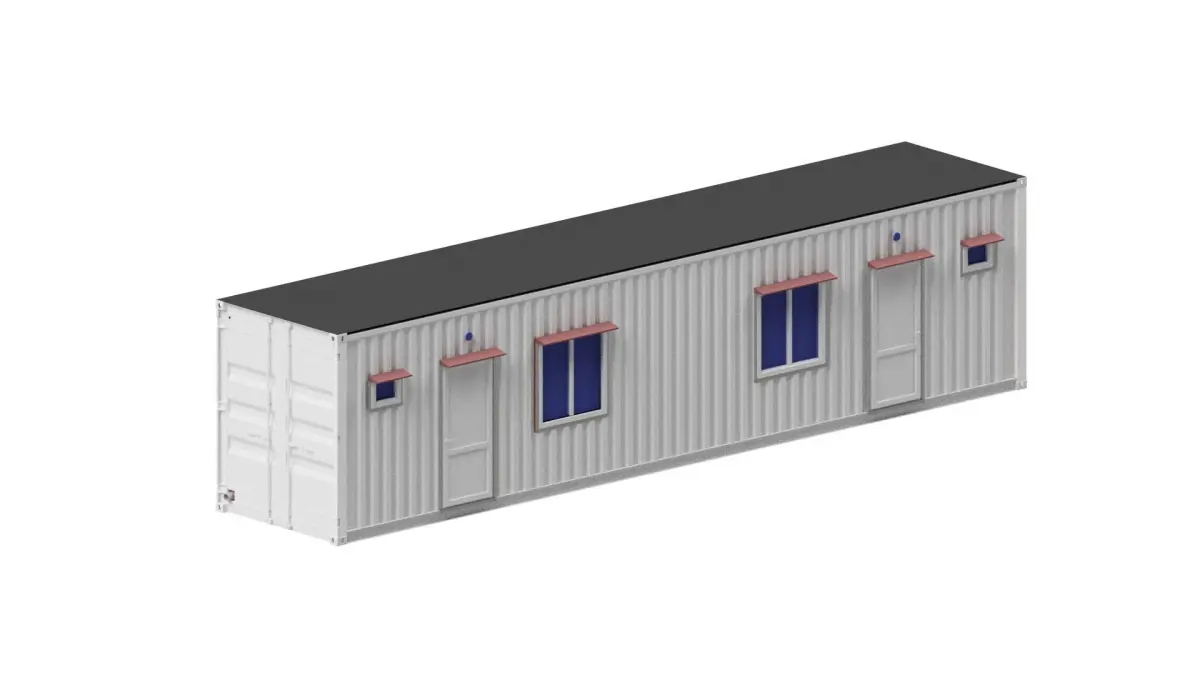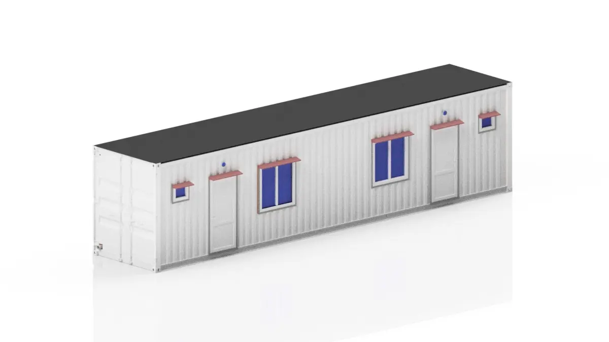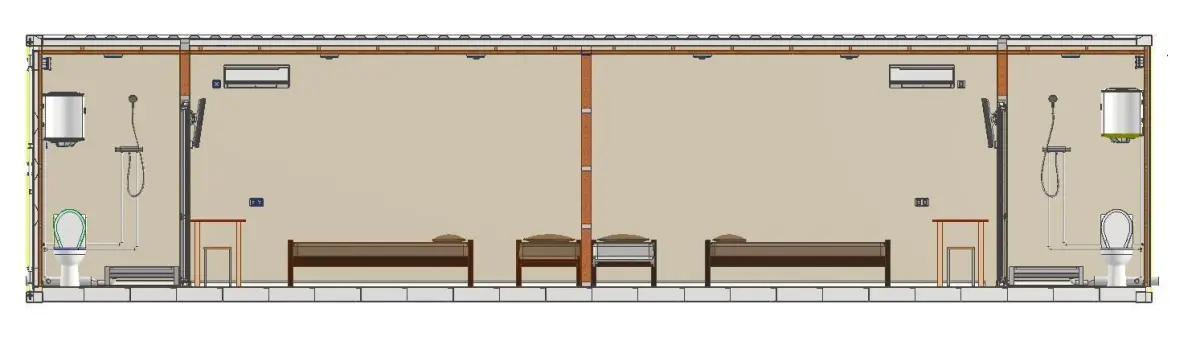 This is a 3D model of a 40-foot container house. The container is divided into 2 rooms, one room is designed for 3 people. Each room has a toilet and shower. The interior of the container is covered with heat and cold protection materials. There is 3 beds, TV, air conditioner, 3 chairs, 1 table and fire alarm in each room. In our country, during the coronavirus pandemic, quarantine zones were built from the same containers