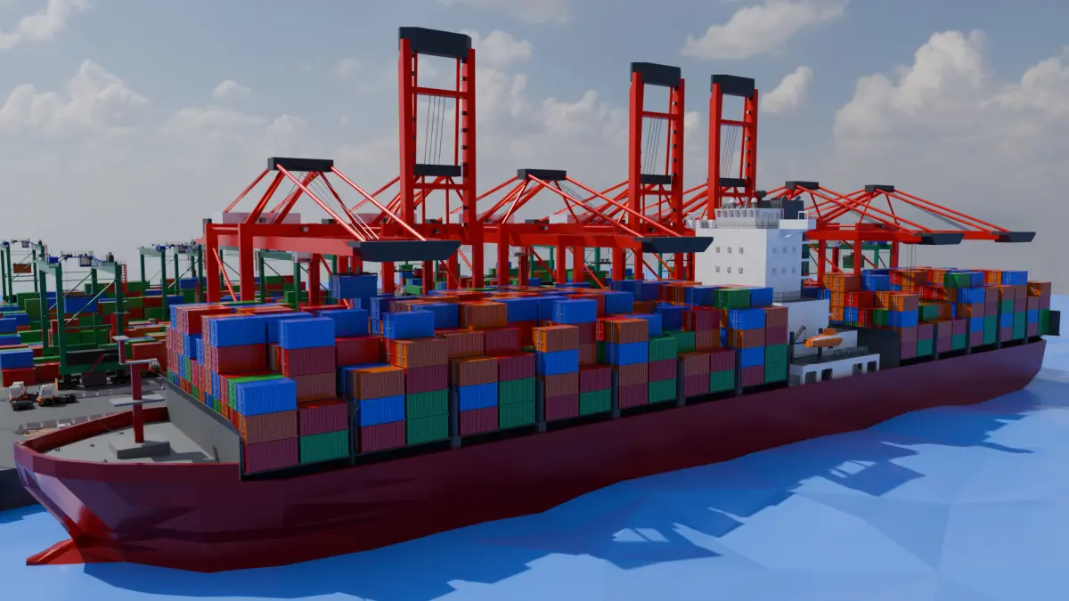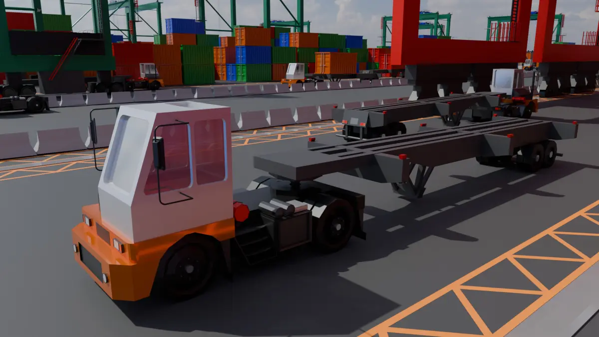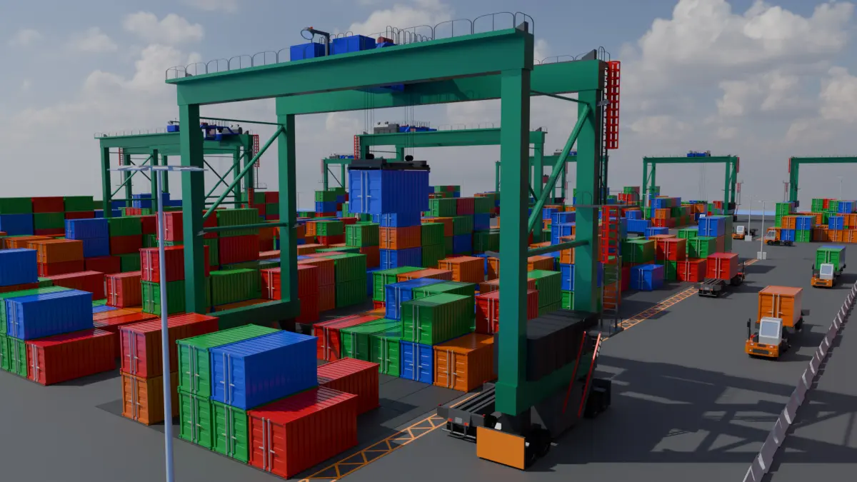 Container Ship, Automated RMG System, Ship-to-Shore Crane, Containers, Container Trailers, Cargo Trucks, Checkpoint, Barrier Fences, Lights, Metal Fences, Water, Road, Road-Barrier Lines, Ropes, and Stands for Containers.