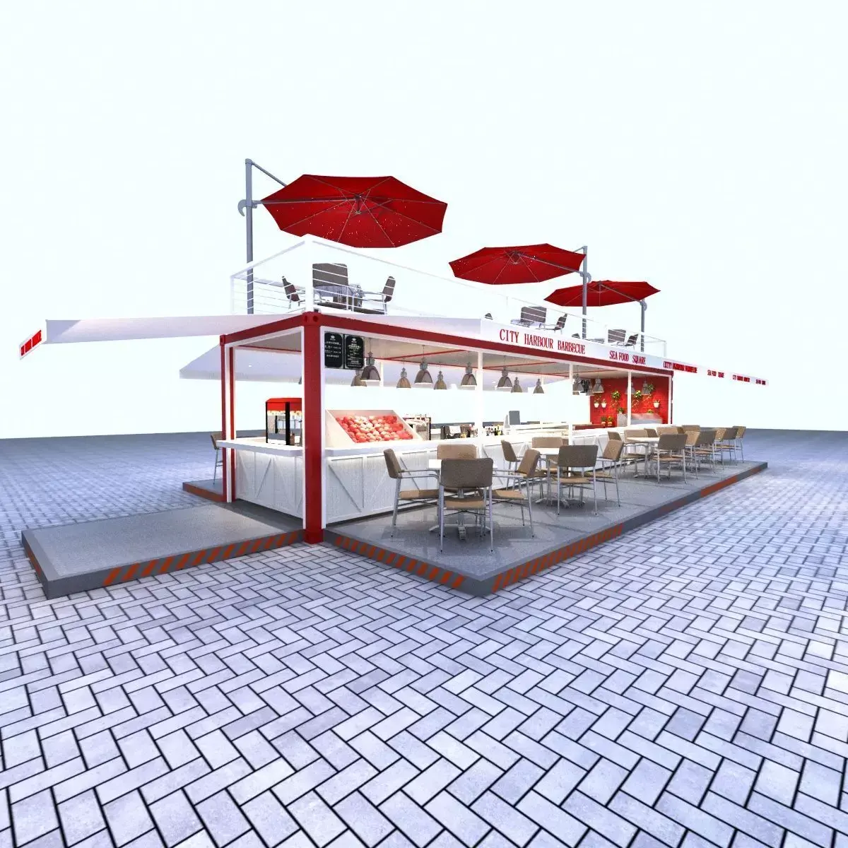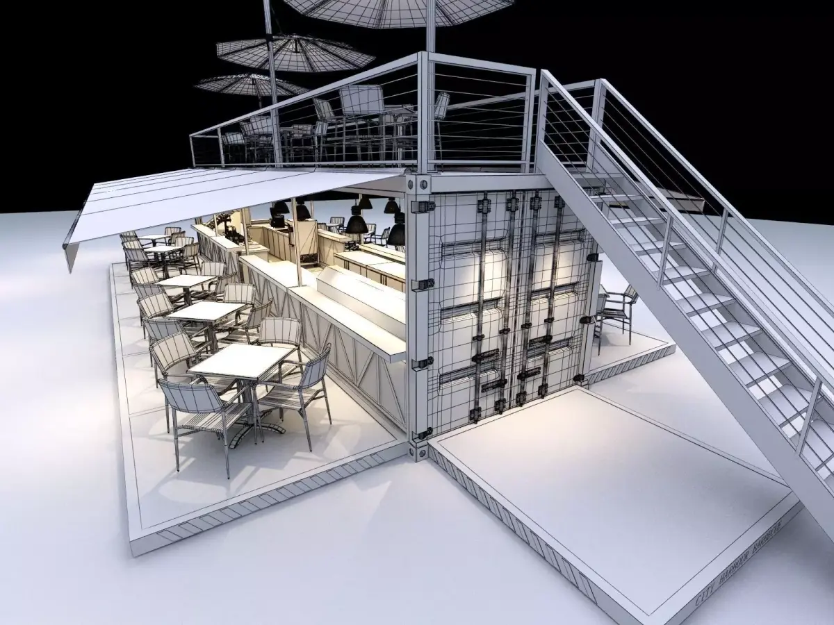 A fully furnished and decorated container restaurant concept.