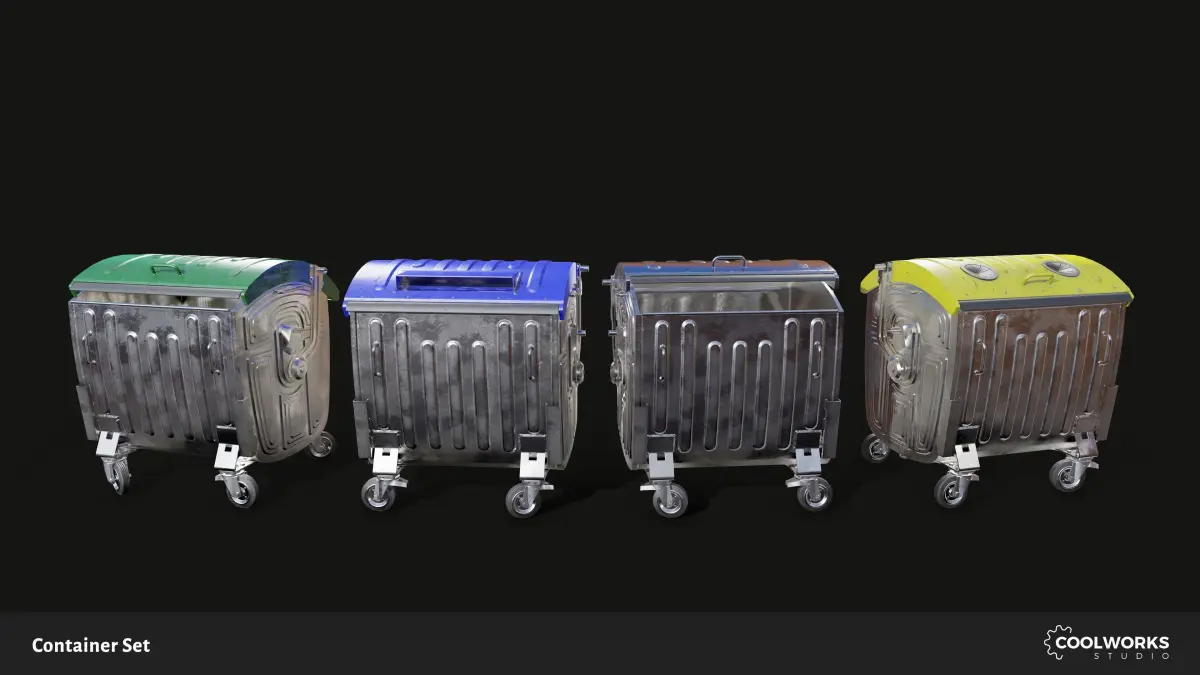 - 2 different cubical metal dumpsters in 3 color variants (blue/green/yellow)