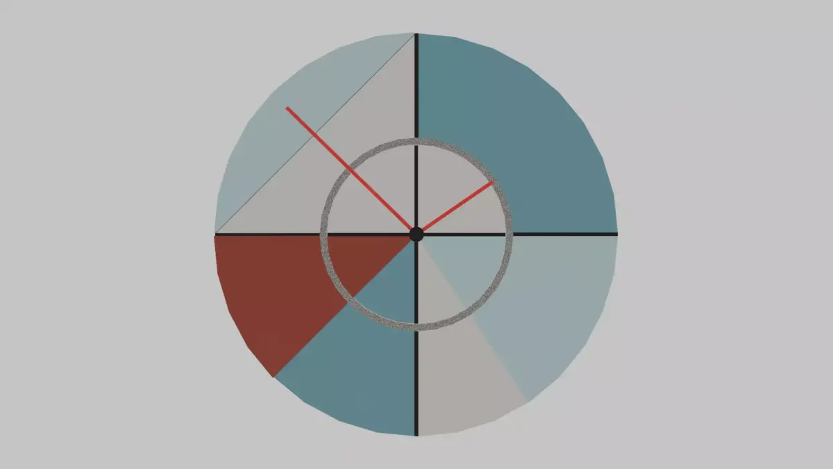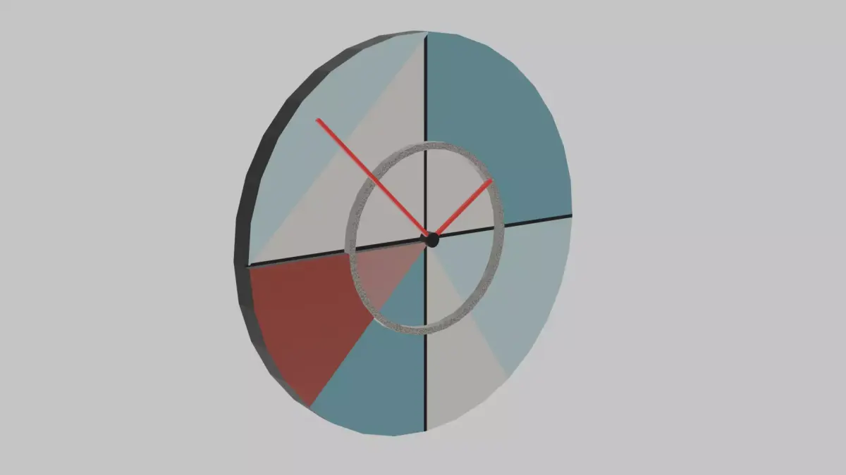This contemporary wall clock features a bold geometric design with clean divisions of color and form. The circular face is divided into angular segments of soft teal, cream, and deep red tones, separated by crisp black lines that emphasize structure and symmetry. A raised inner ring adds depth to the design, while slender red clock hands provide a striking contrast against the subdued palette.