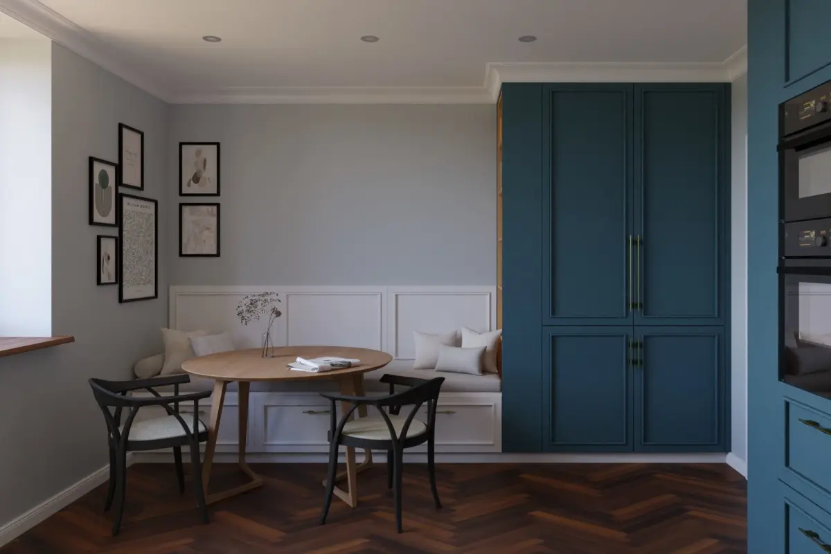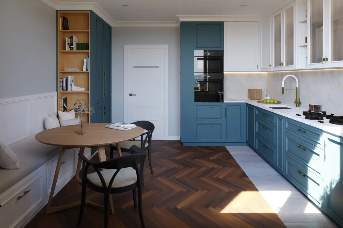 L-Shape Kitchen - classic/contemporary style - blue laminate finish, with brass details and fluted glass ovehead modules.
